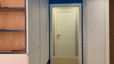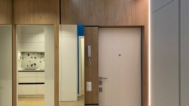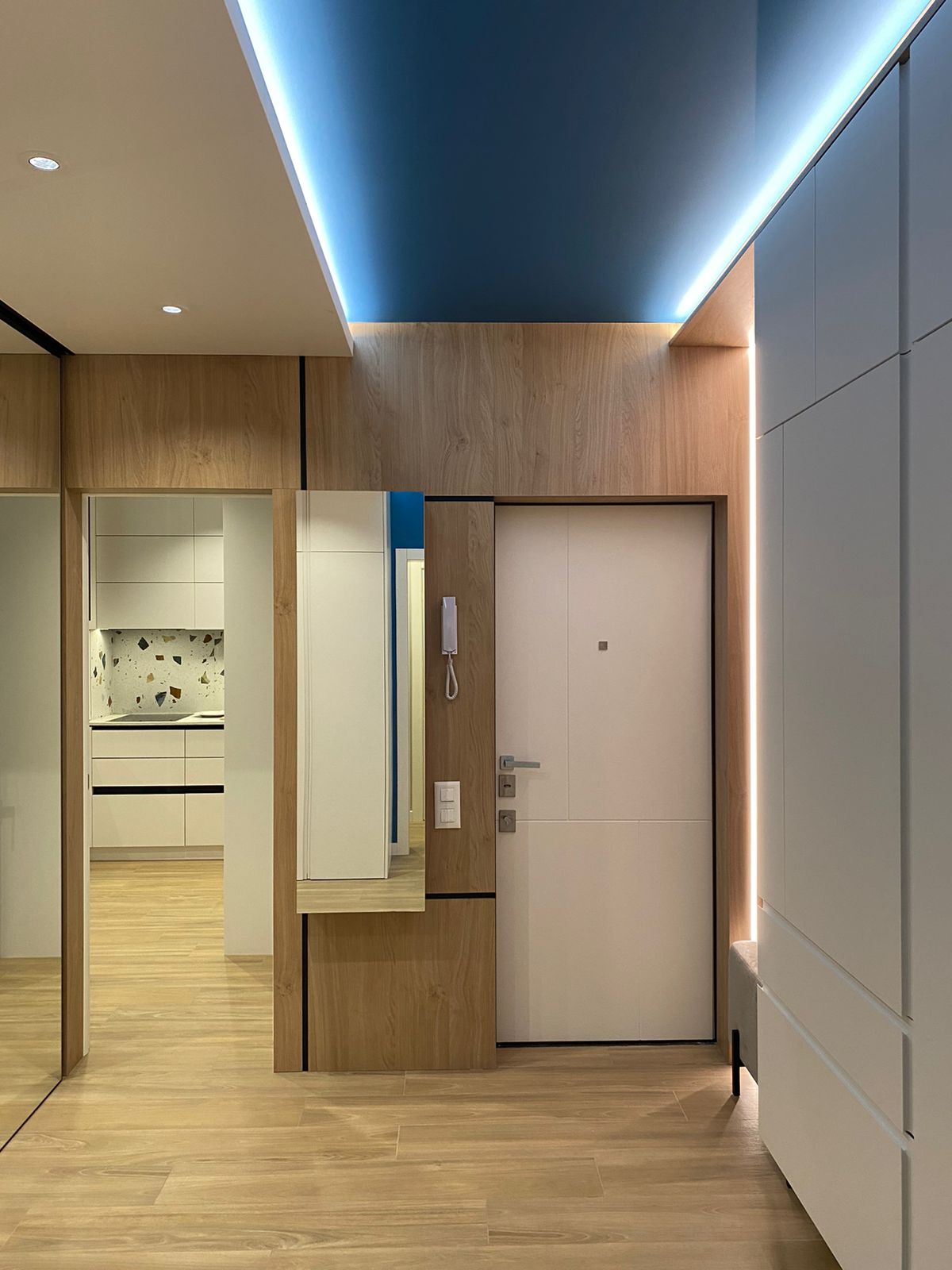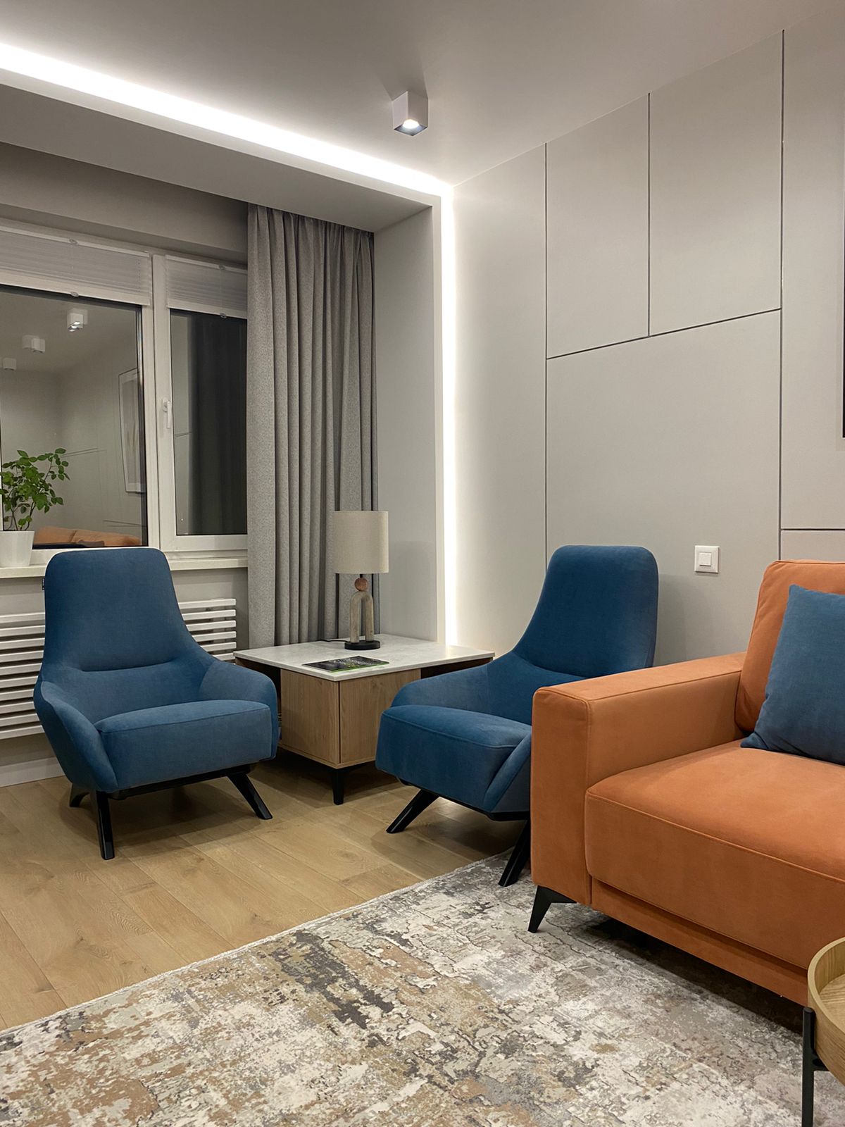The depth of the living space is created by a contrasting combination of colors and textures: complex velvet blue, sand-wood. Matte white and gray served as a base.