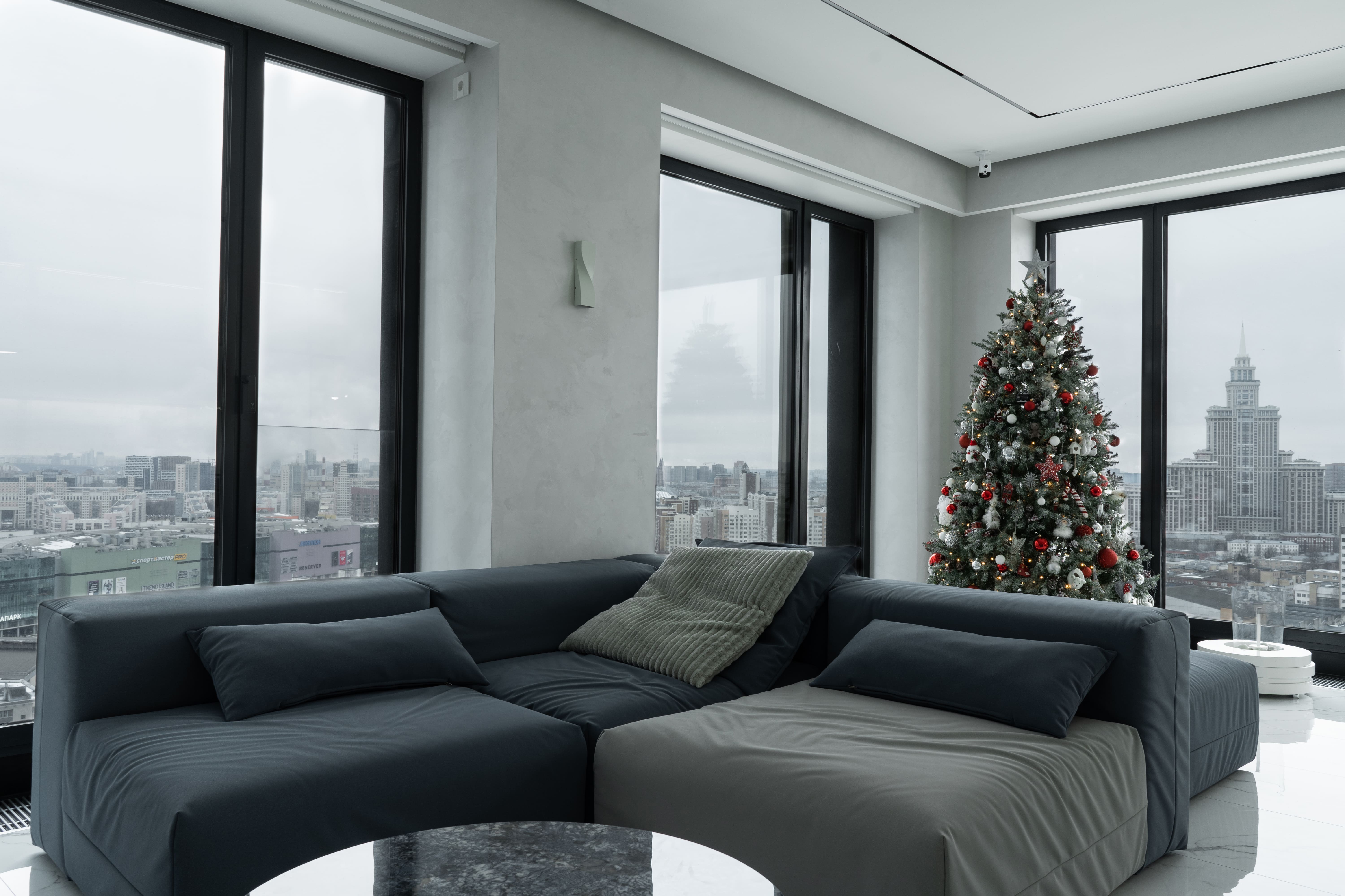 In each room there is a square panoramic window that launches streams of natural light, giving the light design the opportunity to shine. In the kitchen-living room, the line of the built-in track follows the geometry of the windows, and the lamps built into the ceiling merge with it almost imperceptibly.