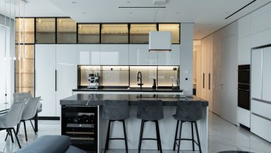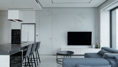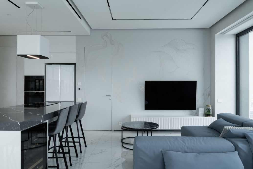 An elite apartment in an apartment building is committed to a monochrome palette, which gives it a cozy and practical space for five family members. The combination of noble shades of gray, white and beige creates an interior that does not tire, even in spacious rooms.