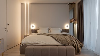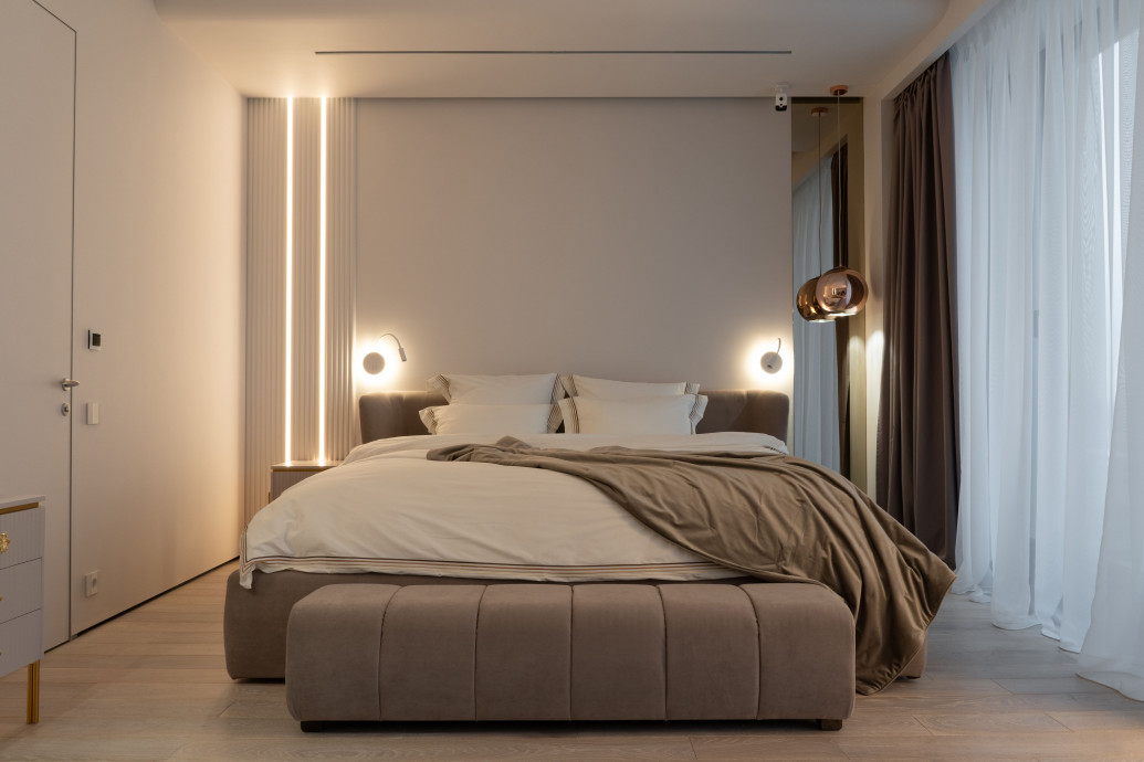 A bright hallway with vertical light lines focuses on the mirrors, giving them height. In the master bedroom, the control of the backlight and light lines will give you the opportunity to create a cozy atmosphere by adjusting each element individually.