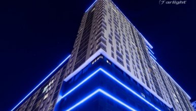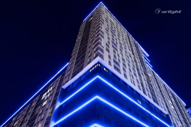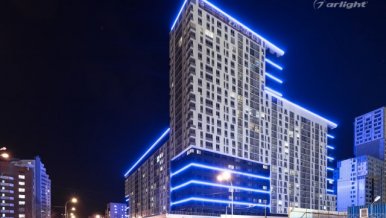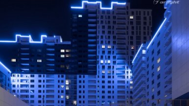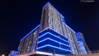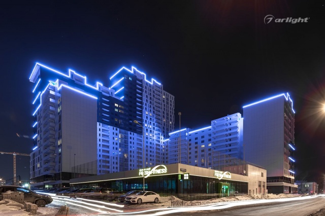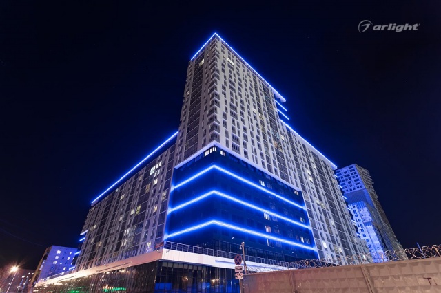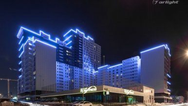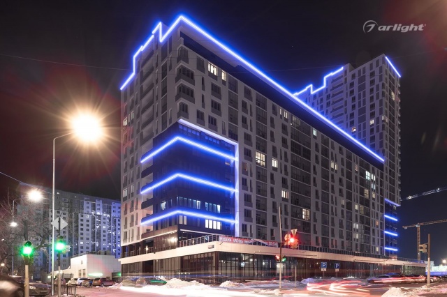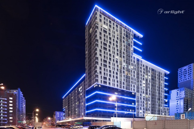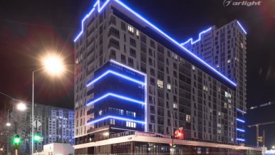 Bright LED lighting of the Krylov residential complex emphasizes the scale of the project and attracts attention to it.