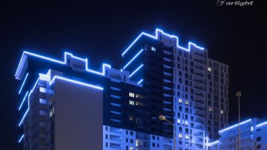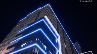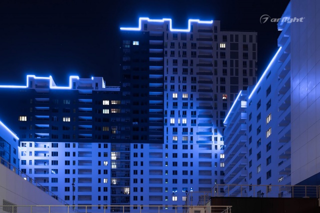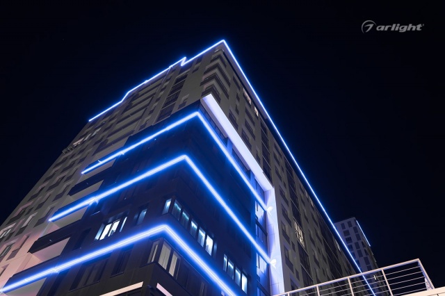 The project was realized on the basis of Arlight equipment. Sealed LED strip of blue color retains full functionality at temperatures from -20 to +45 degrees Celsius. For design and ease of installation LED strip is fixed to the aluminum profile. Frosted screen additionally diffuses the light emitted by the tape, as well as gives the backlight an aesthetic appearance at any time of day.