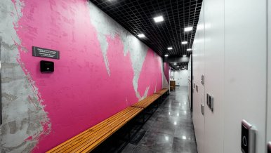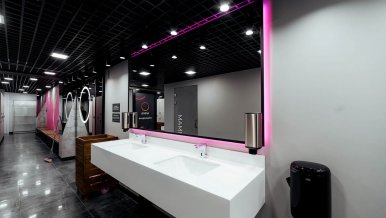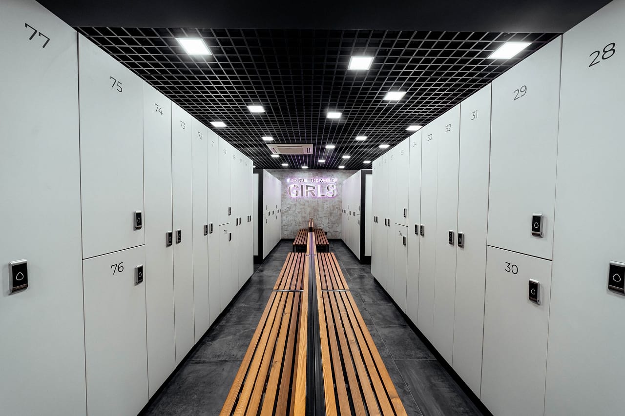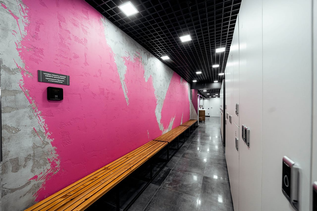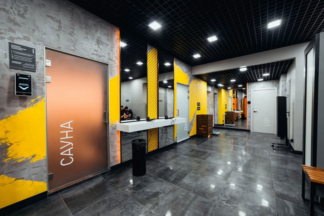 The space of the Arena fitness center in Perm is literally filled with various lighting solutions that emphasize the stylish design and status of the club. Almost monochromatic interior looks winning thanks to a large number of textures and bright color accents, made, among other things, with the help of LED lighting.