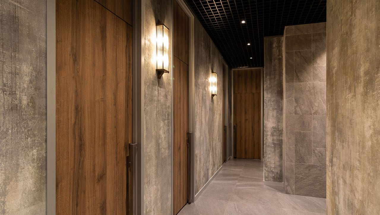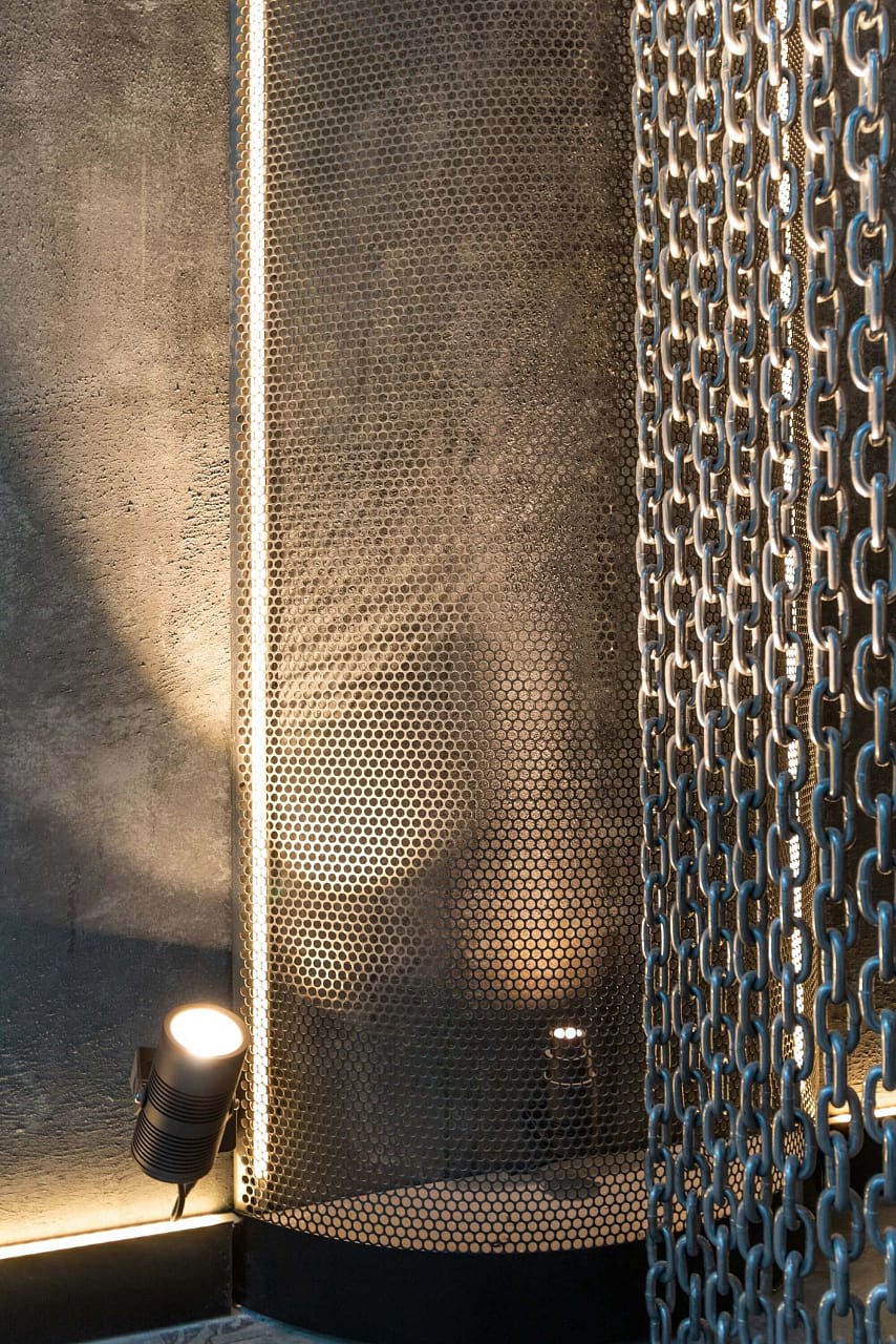 LED lighting is actively used in the project, also exclusively in warm white light. Decorative light strips, soft diffused glow, backlighting - the light source itself is often invisible, visitors are simply immersed in an atmosphere filled with contrasts of warm lighting and brutal, sometimes aggressive interior.