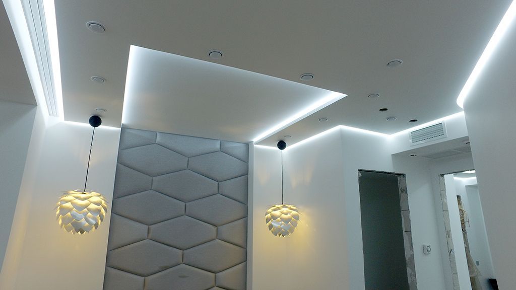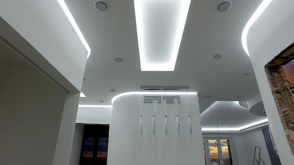 The desire of the owners of the apartment was to create soft background lighting, comfortable and sufficient for most cases. The design project involved a large number of ceiling niches, in which the LED strip was placed in accordance with the task.