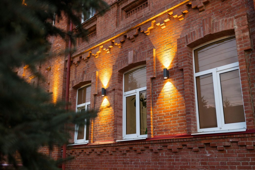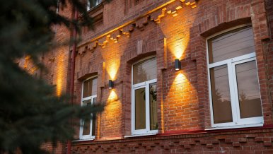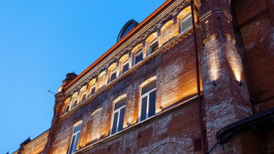 The FORMA-WALL series of luminaires with two-way up-down glow not only emphasizes the brick texture, but also provides ample illumination around the building. LED strips evenly illuminate the building's end and patterned cornices, allowing decorative elements to be highlighted even in the dark.