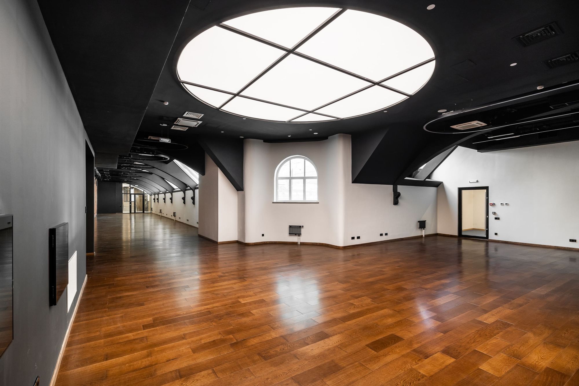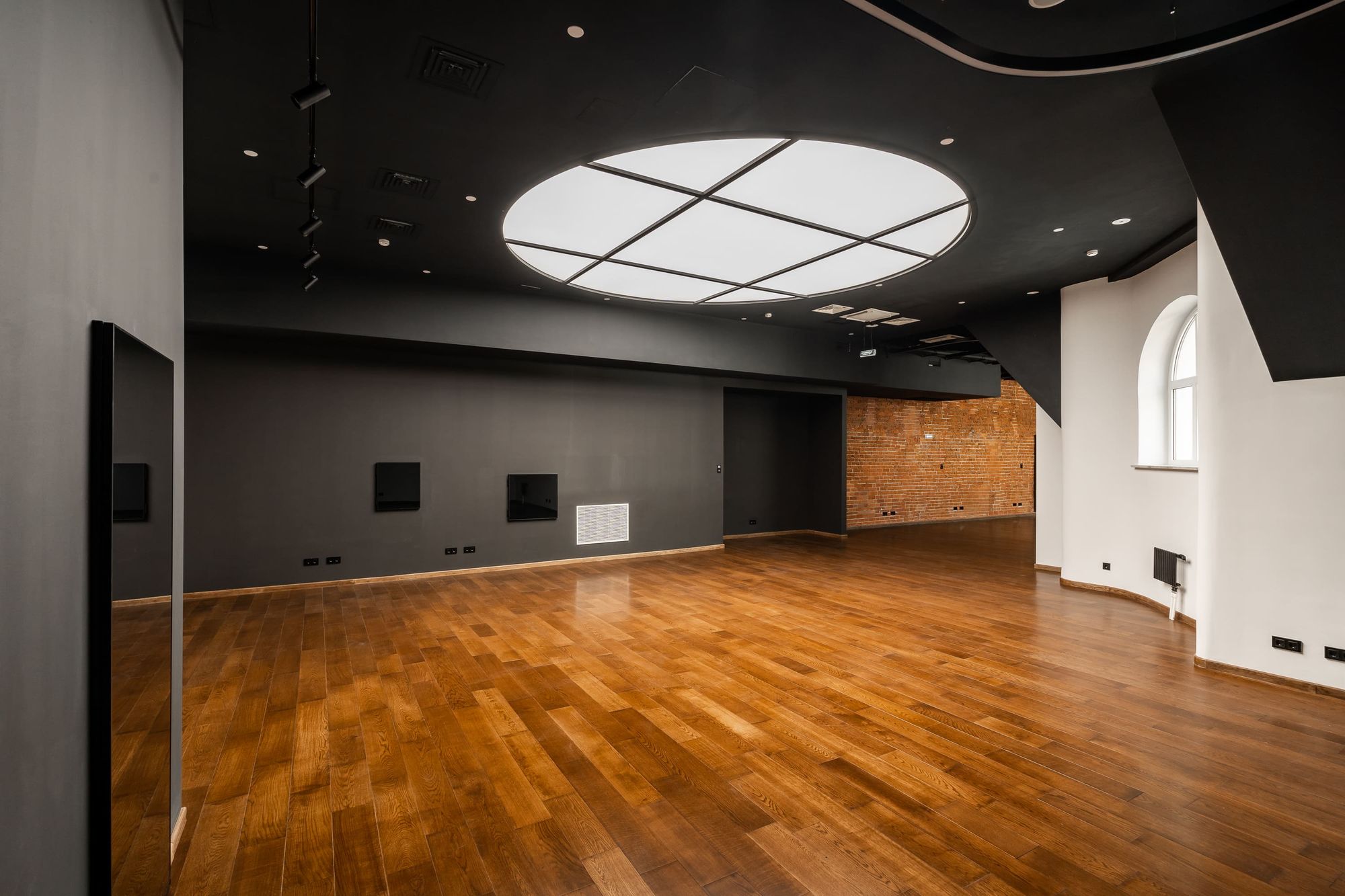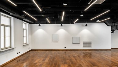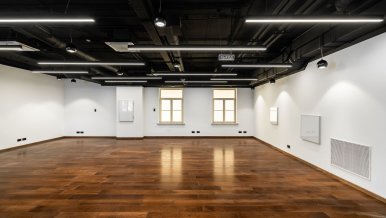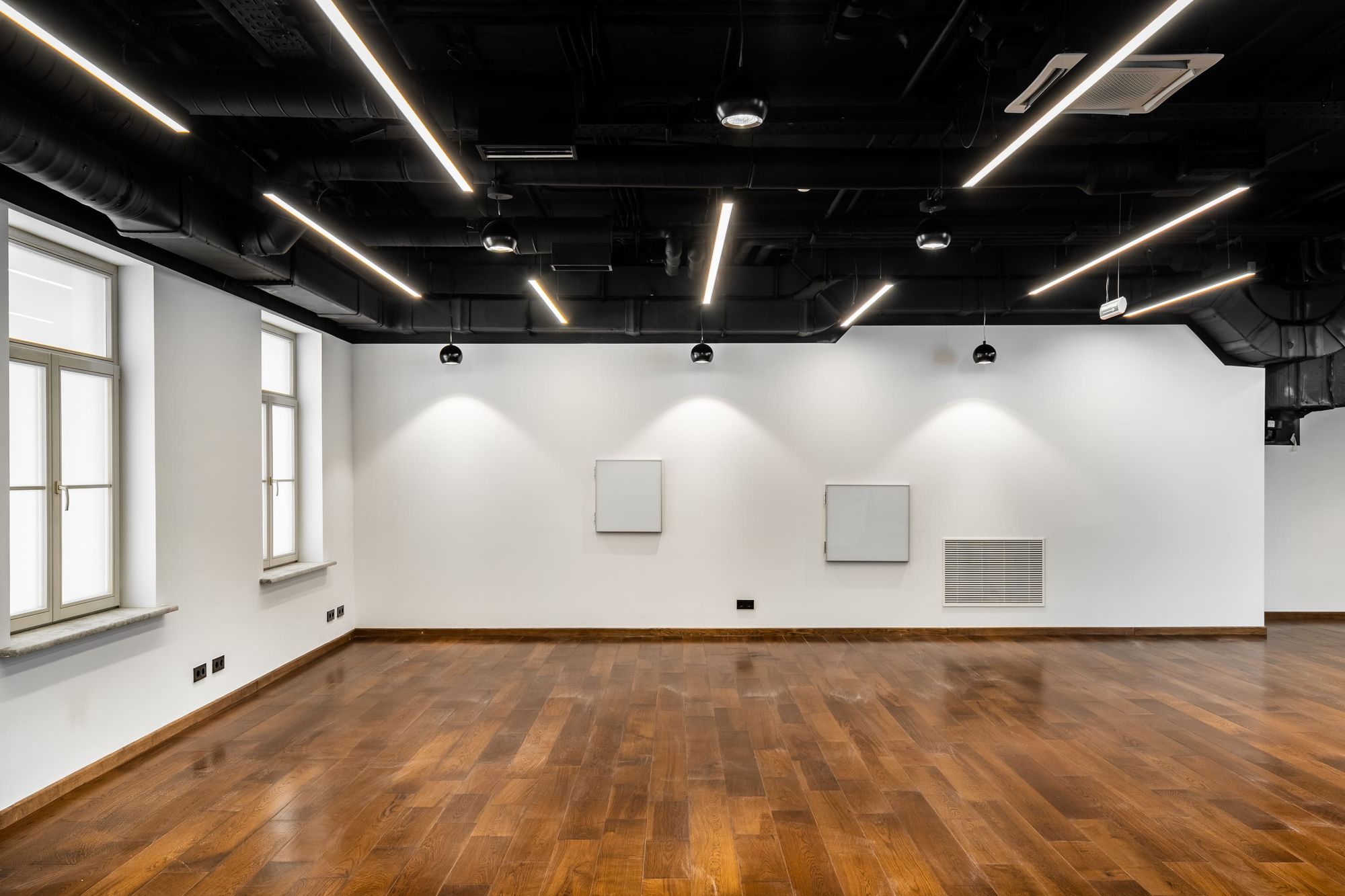 For the main lighting, suspended linear luminaires are used on the ceiling with open communications. Here again, the play of contrasts is noticeable - the industrial ceiling and soft warm light from the luminaires.