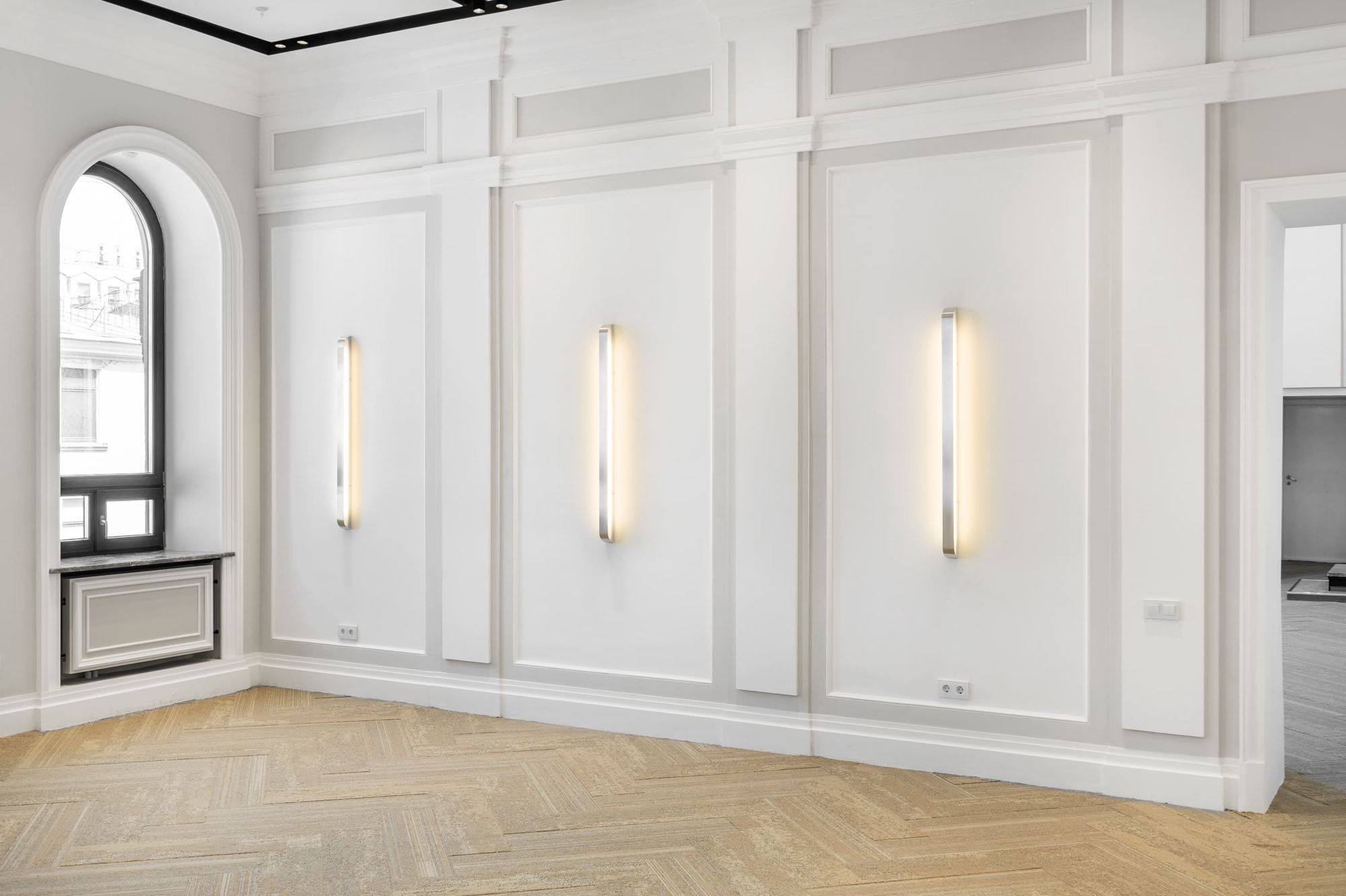 Stylish wall decoration with a glossy shine is emphasized by light accents of warm white glow. This interesting effect is based on the harmony of contrasts. The soft, diffused contour light gives the rooms a visual weightlessness and transparency.
