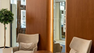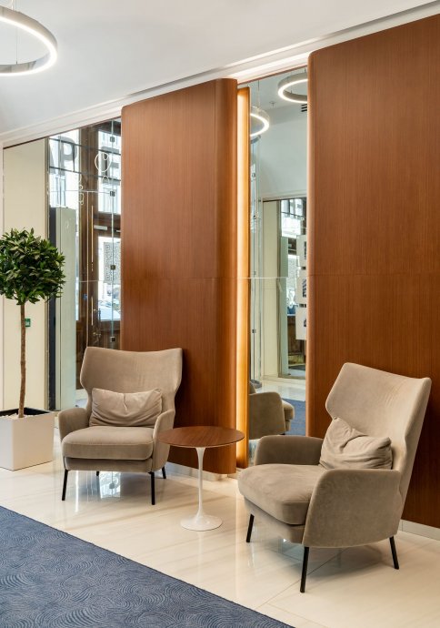 The key light object of the business center is an imitation of a large window located directly in the ceiling. A large area of the “window” is covered with a diffusing screen, behind which mounted LED MIX-tapes with a high degree of color rendering.