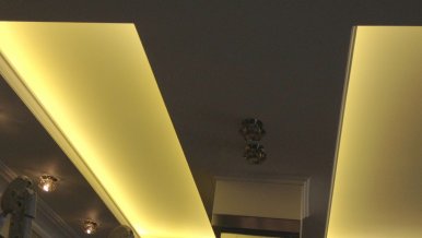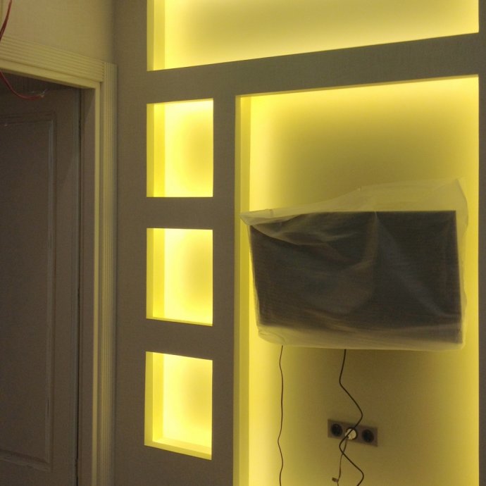 In the house there is both monochrome backlighting and multicolor. For example, in the kitchen and in the children's room used RGB-tape Arlight. In all other rooms more classic version of backlighting white warm glow. The same LED strip illuminates the niches around the TV zone.