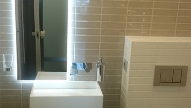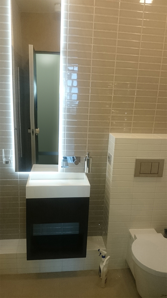 Mirror lighting was installed in the bathroom. LED tape is glued to the back of the mirror, so it acquired a luminous contour, not hitting the eyes.