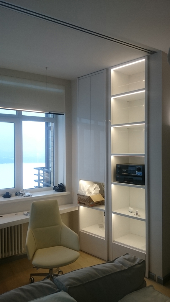 The third type is the illumination of the cabinet. LED strip is installed on the shelves. Soft backlighting emphasizes the texture of interior items placed in the closet, and just helps to quickly find the right thing.