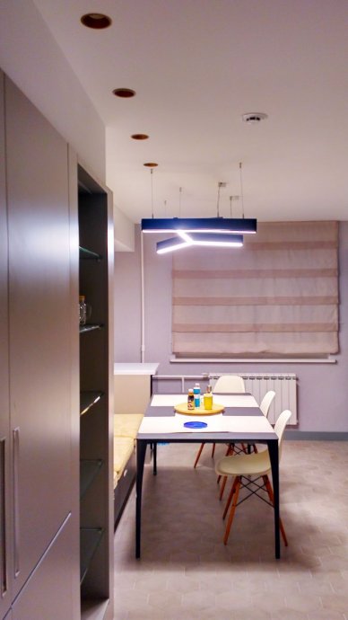 In the kitchen above the table is a stylish modern pendant light fixture of geometric shape, made of LED tape and aluminum profile.