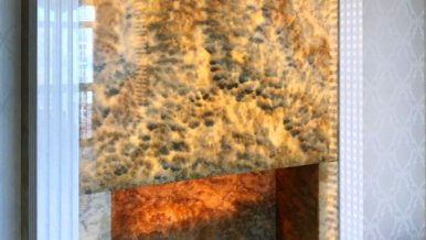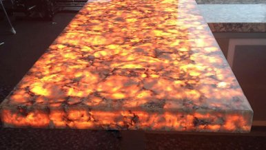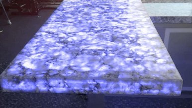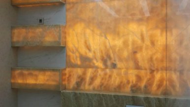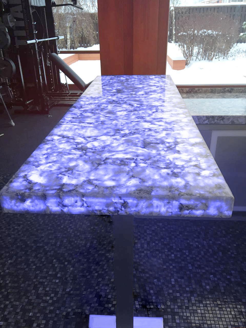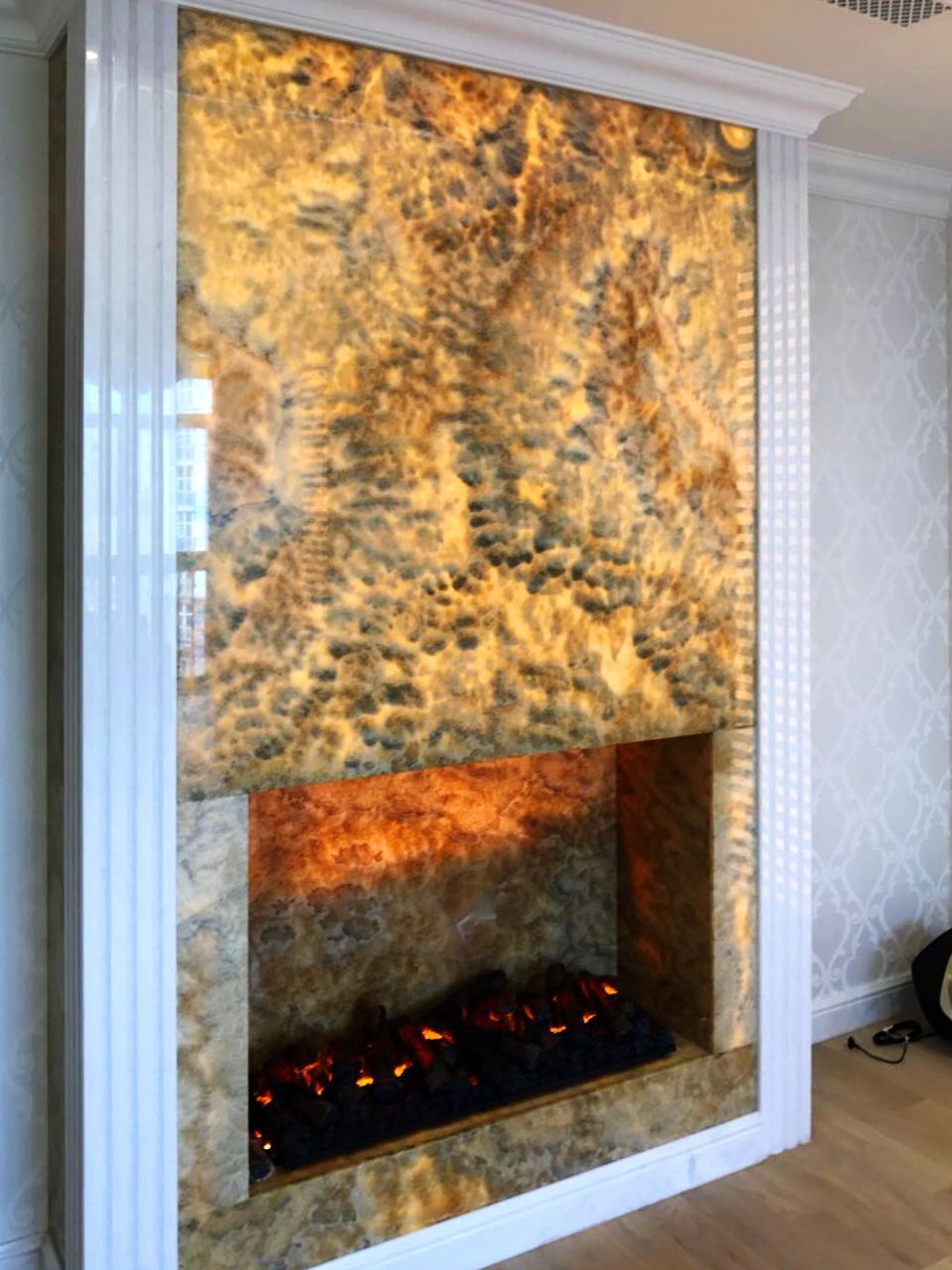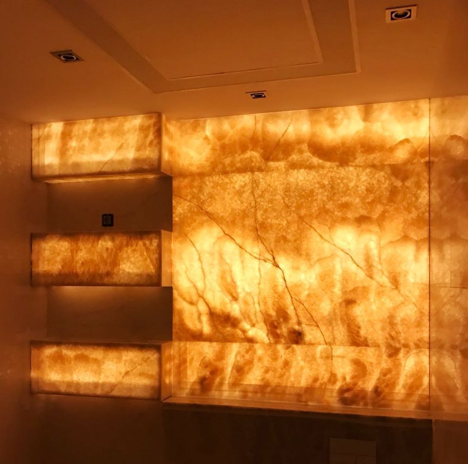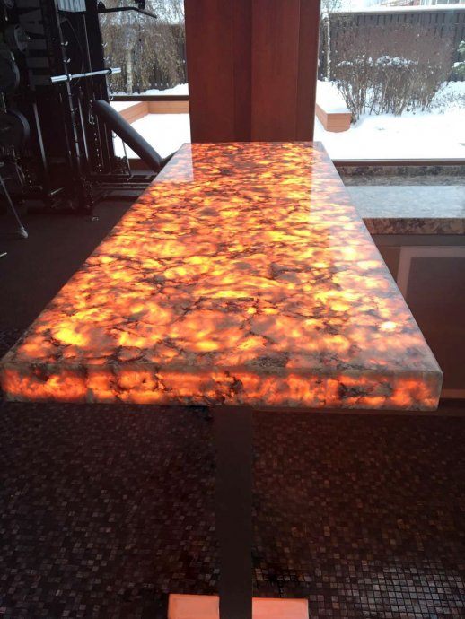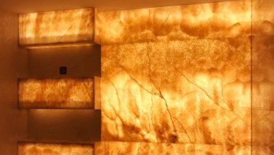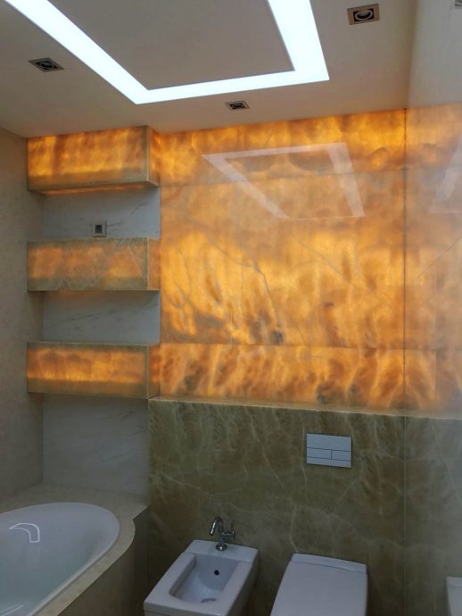 Such a solution as lighting of natural stone deserves special attention. Decorative panel of onyx, smoothly passing into the niches in the bathroom, creates a very soft and warm glow. The same technique of stone illumination is used in the design of the fireplace portal and the bar counter in the gymnasium. In the latter variant RGB-tape is used, with the help of which you can dramatically change the mood of the room.