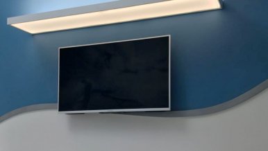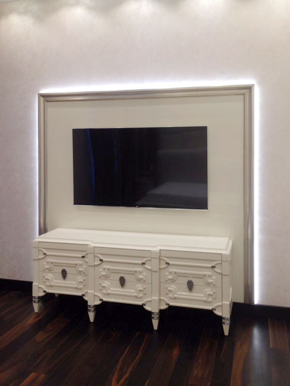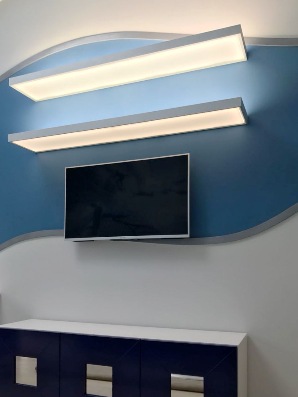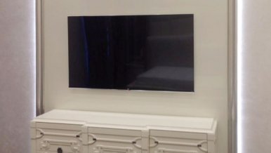 The TV zones are designed in completely different ways. And if in the living room it is a decorative portal, the perimeter is decorated with LED lighting, in another room above the screen there are open shelves made of translucent plastic and emitting soft, diffused light.