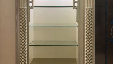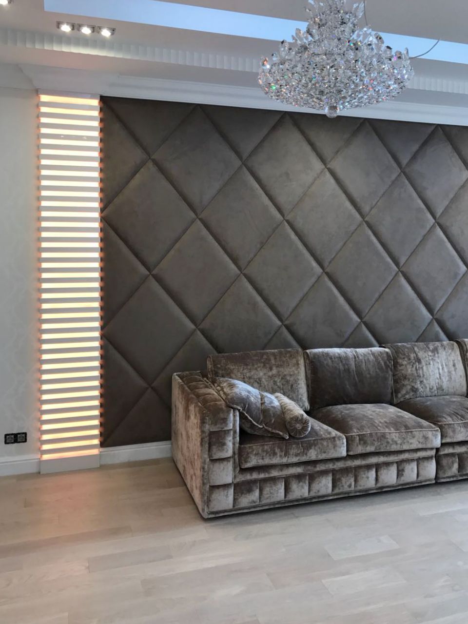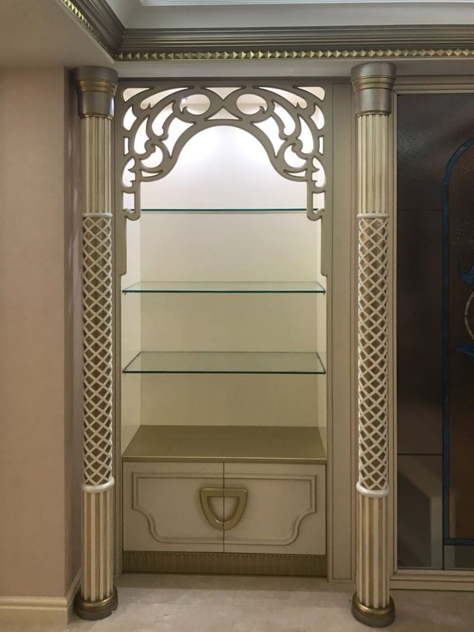 In the living room along the perimeter of the ceiling is installed multicolor lighting. Soft zone with a sofa at the edges is framed by luminous pilasters. Decorative niches with glass shelves, as if appearing from an oriental fairy tale, also attract attention with soft lighting.