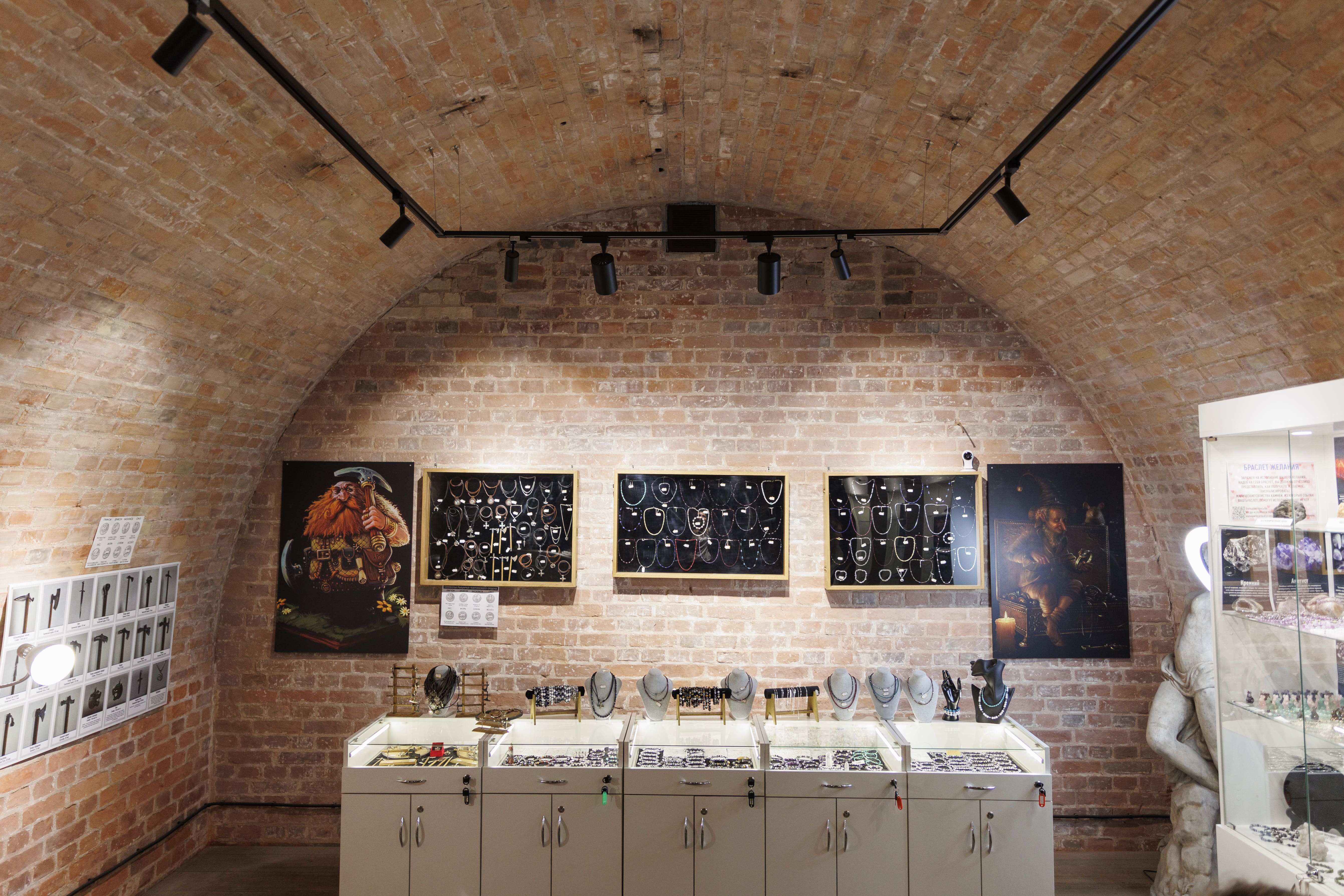 The black tracks themselves, which are suspended from the vaulted ceilings using cables, echo the metal grilles, merging into the overall pattern. ZEUS luminaires have a simple black cylindrical body and do not attract unnecessary attention. At the same time, they have a variable angle of the light beam (from 20° to 60°) and rotatable housing. This allows you to customize lighting scenarios for different expositions, avoid unnecessary backlighting, preserving the mysterious twilight in the rooms.