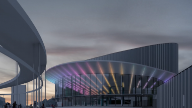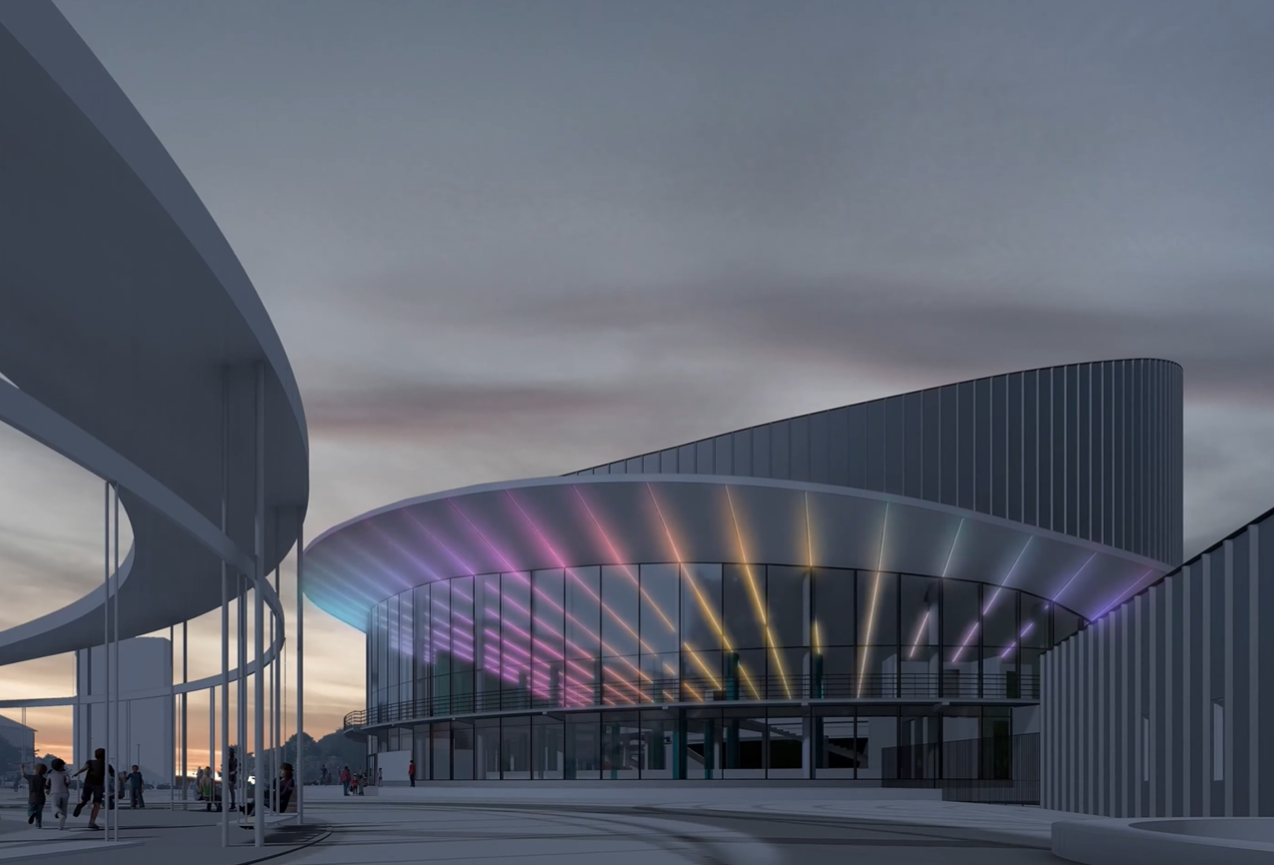 MOONLIGHT flexible neon with a high degree of sealing was used for the project. The ribbons were installed both inside the building - in the lobby - and outside, as if penetrating it through. Shimmering rays of light resemble a continuous firework, creating an atmosphere of joyful celebration.