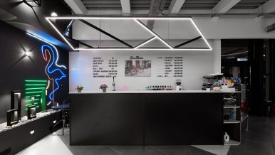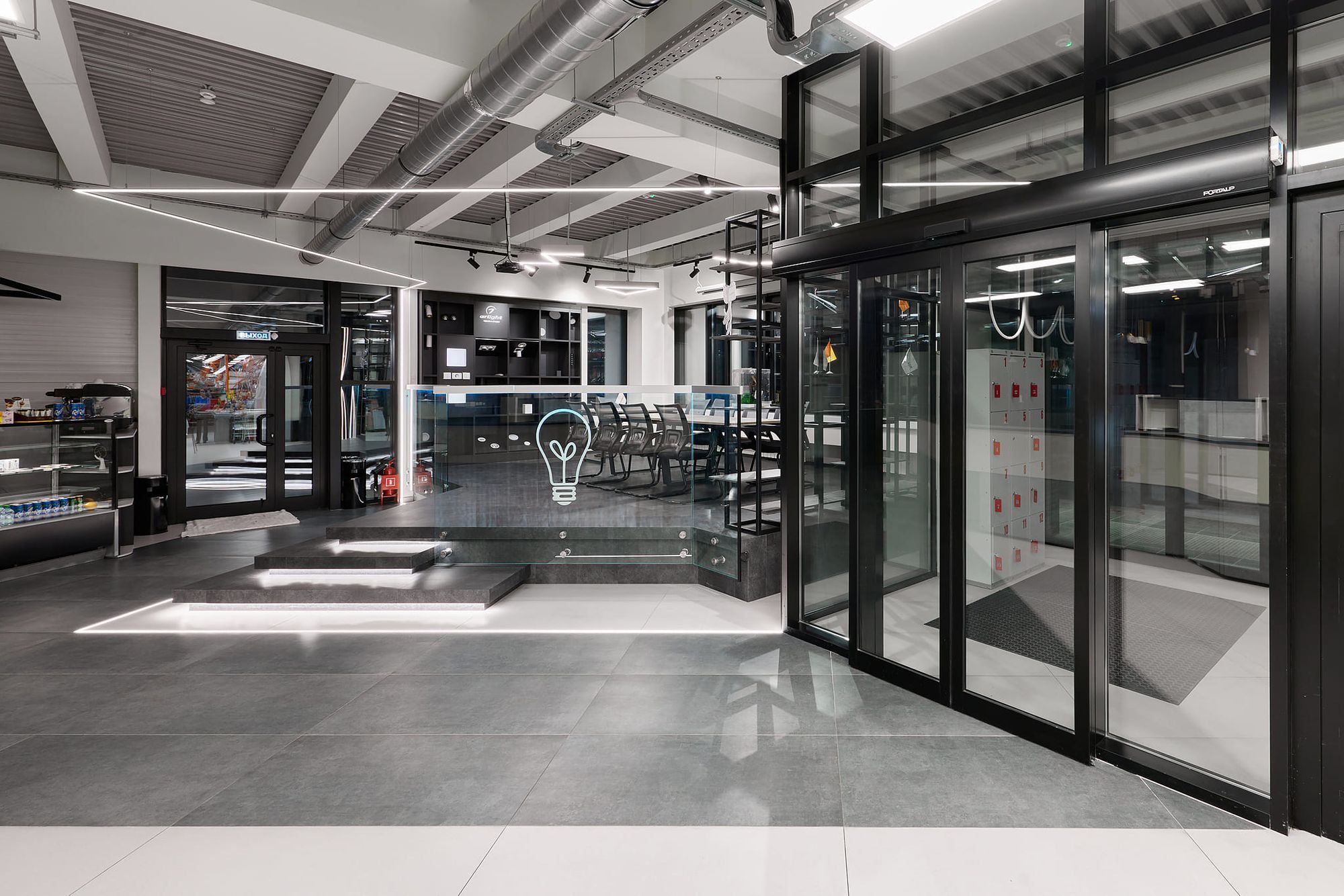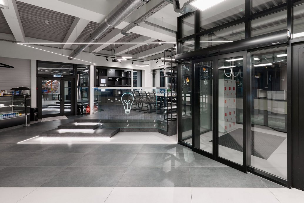 In the cafe and co-working area unique multi-piece suspended compositions of light lines were installed. They not only create a special atmosphere and perfectly match the minimalistic interior, but also show customers all the possibilities of electrical products, which is especially important for a store of this specialization.