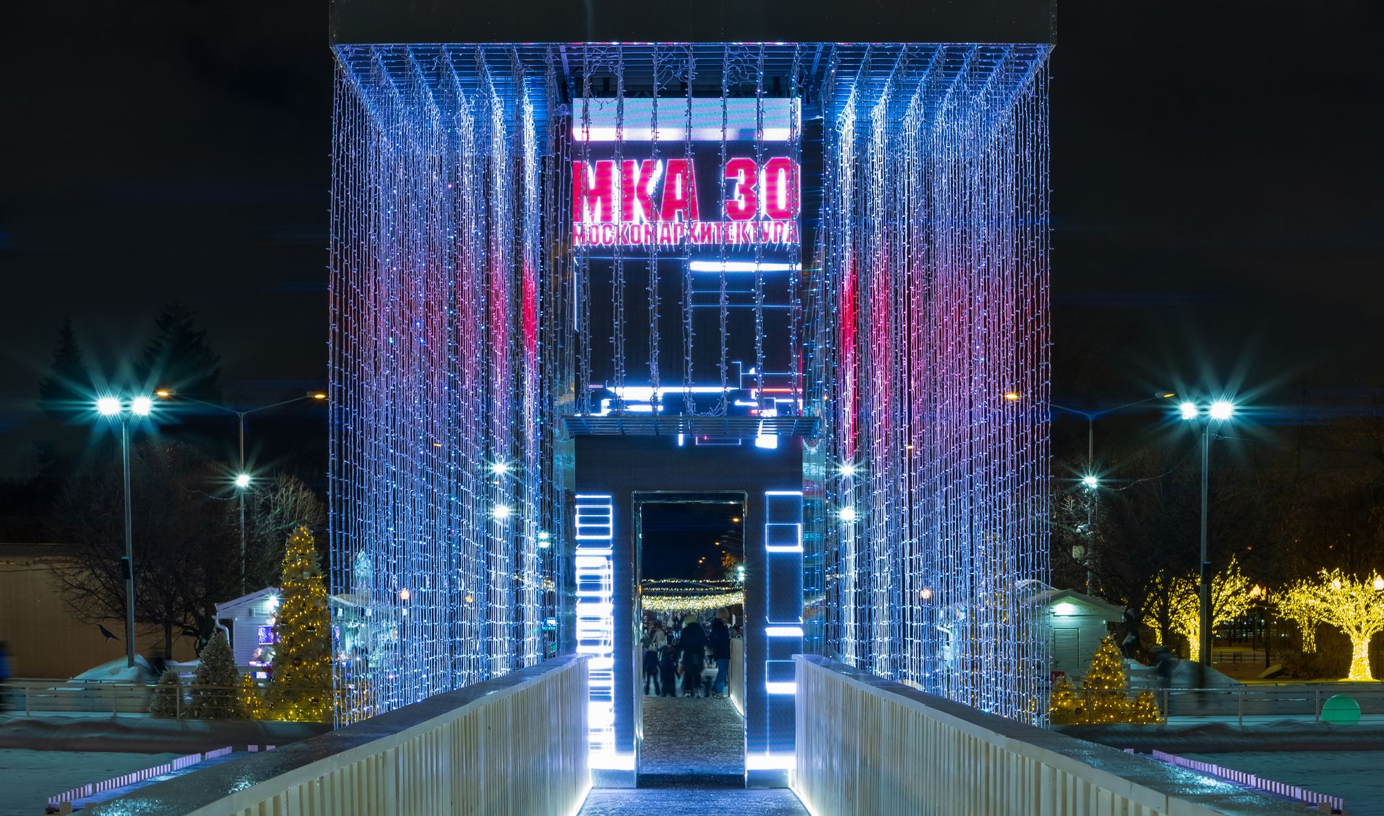 Mirrored skating rink in Moscow's famous Gorky Park. Gorky Park in Moscow's famous Gorky Park strikes the imagination of visitors with its enchanting light structure: the curtain arch consists of 287 ARD-STRING LED garlands.