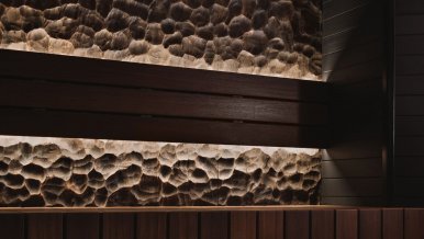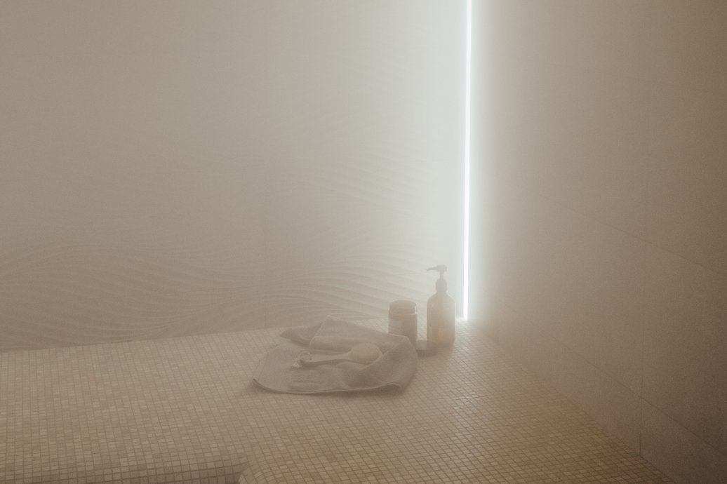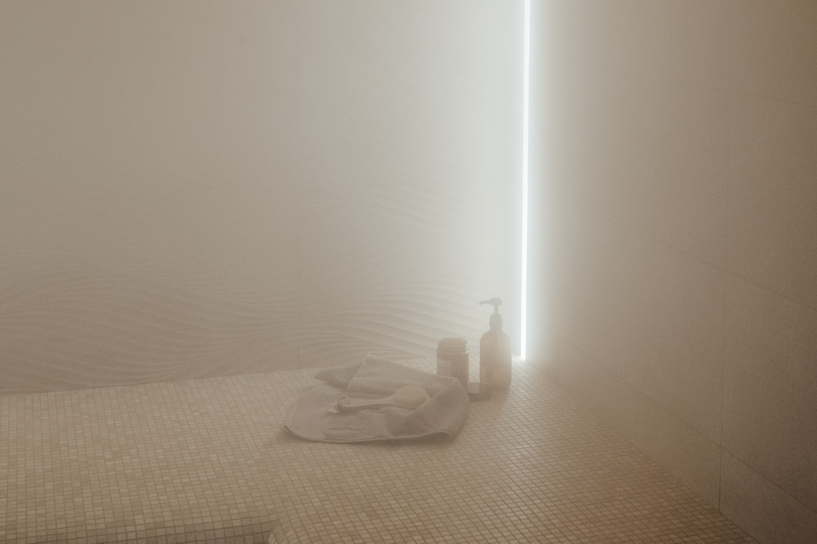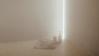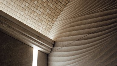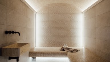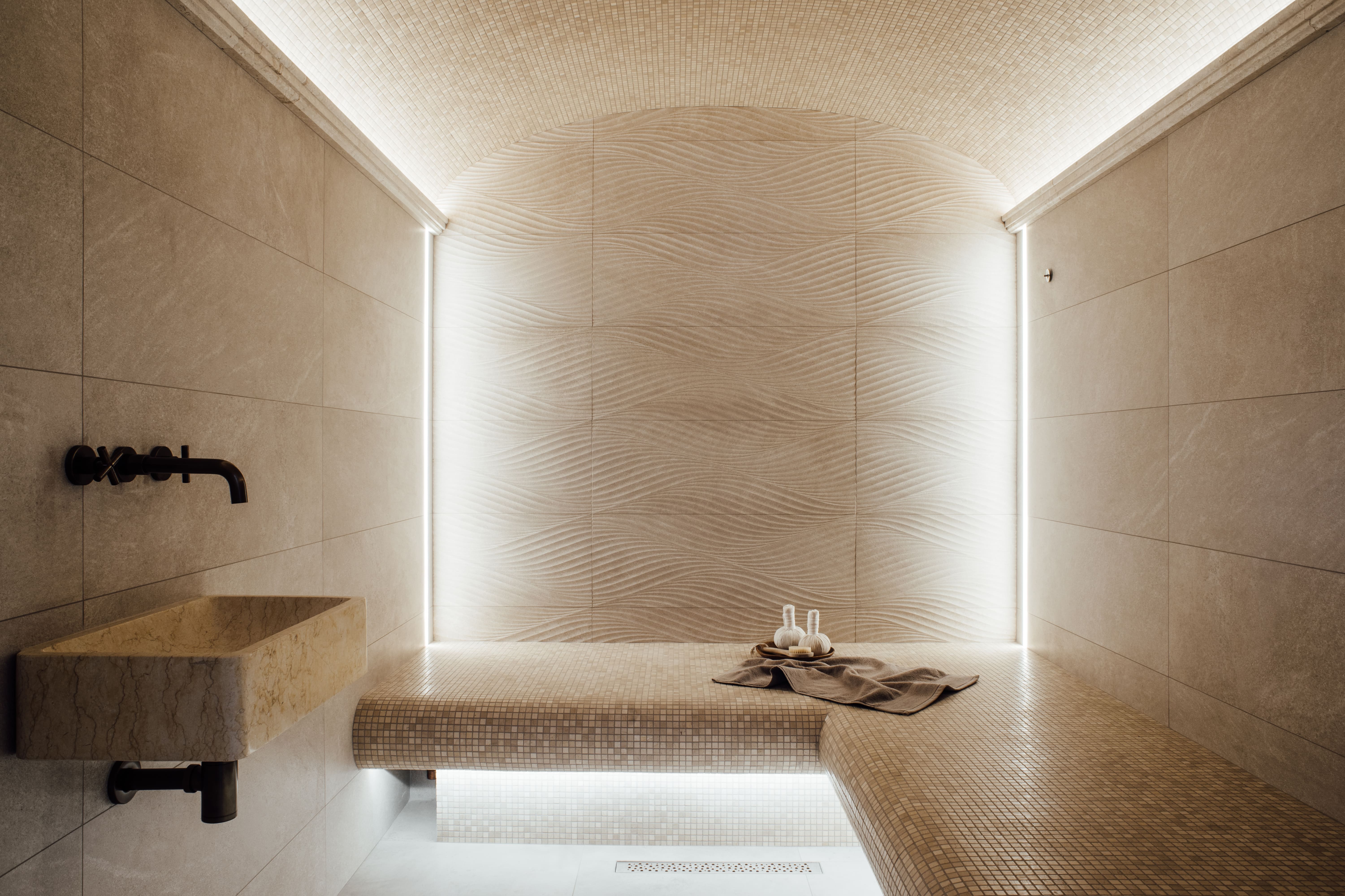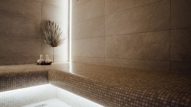 A relaxing atmosphere of calm, unhurriedness and peace reigns in the hammam thanks to the pastel shades of the interior. At the same time, the interior does not look simple. It is made rich by various textures: fine mosaics on the ceiling surfaces and benches, smoothness of polished marble and relief of slabs on the walls.