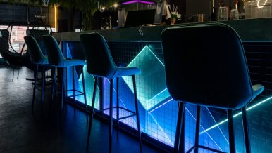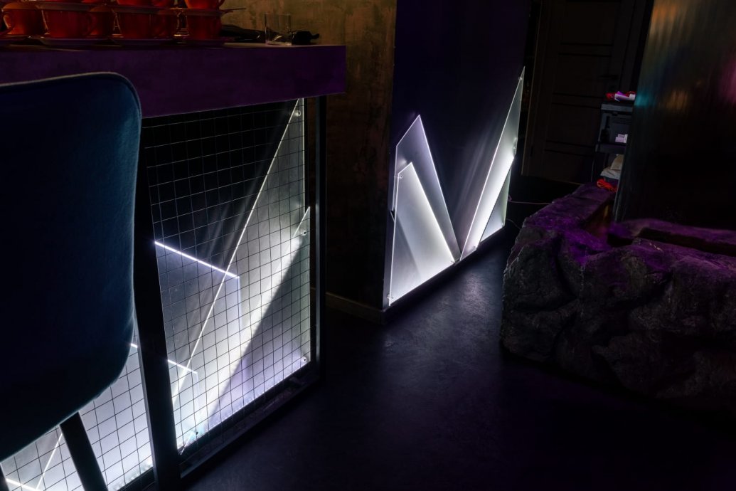 The design of the bar counter is interesting: an installation of translucent panels with cold backlighting resembles glaciers, which psychologically stimulates visitors to order drinks from the bar.