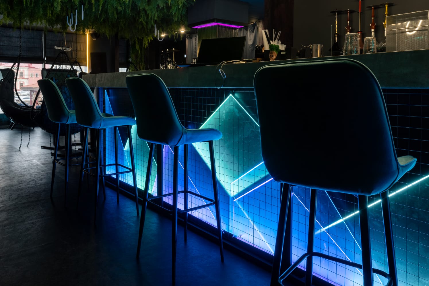 Facility's interior is made in dark colors, which creates a feeling of coziness and privacy. The feeling of merging with nature is provided by a large number of hanging ferns on the ceiling and walls. The colored lighting of the hookah bar adds lightness, liveliness and somewhat fantastic atmosphere. Abstract colored composition on the wall and RGB lighting also set a relaxing informal tone.