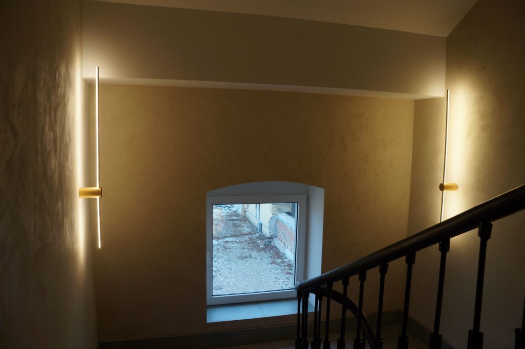In front of the hotel entrance is a staircase that is illuminated on the sides with a warm glow. This illumination harmoniously combines with the general light flow coming from the chandelier, setting the direction of movement and at the same time creating a cozy atmosphere.