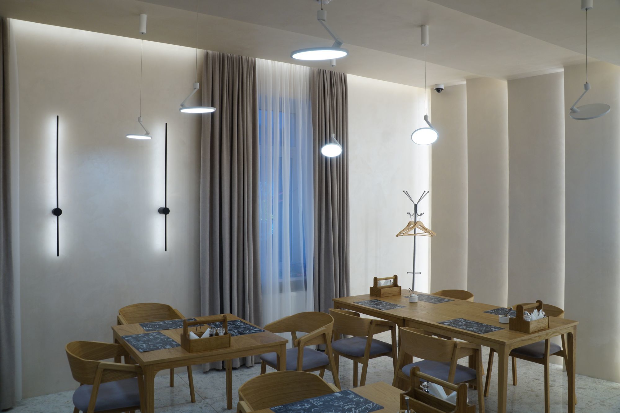 The hotel café uses a bright combination of various lighting fixtures, which gives the space life and spontaneity. Pendant and wall lamps of different shapes and models are perfectly combined with curtain lighting.