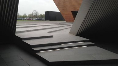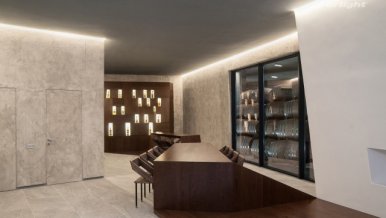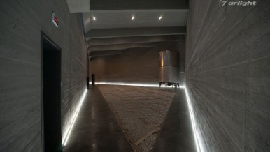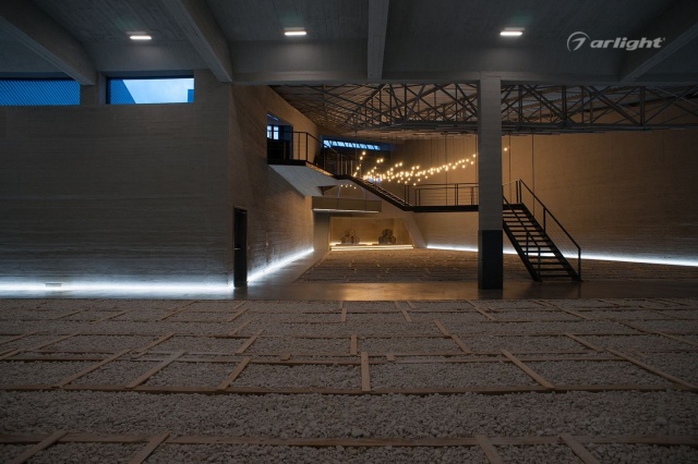 LED lighting plays an important decorative role in the modern building of the cognac factory's storage museum. Both outside and inside, in the most different rooms you can find light accents: from small laconic spots to entire installations of pendant lights.