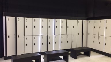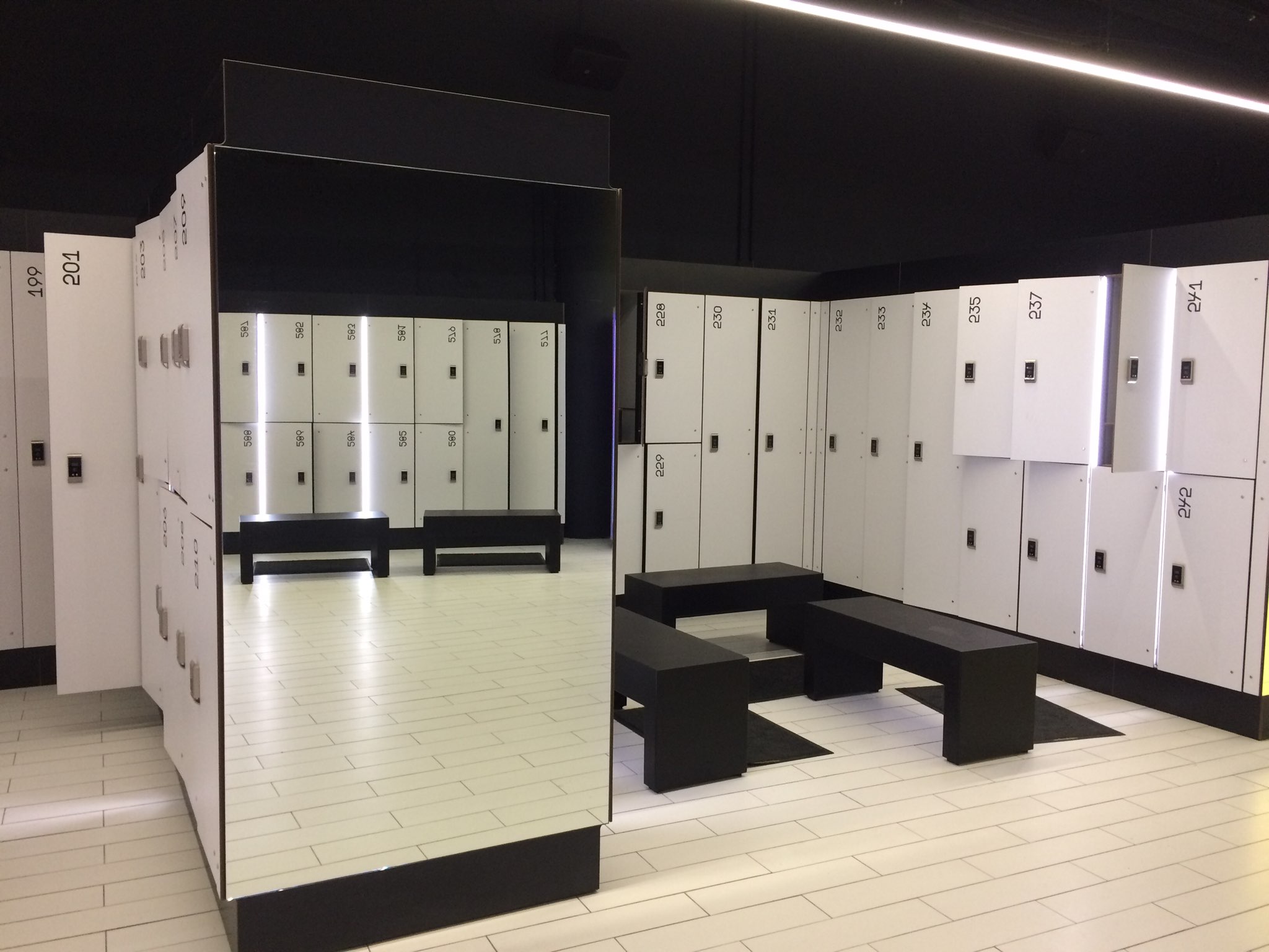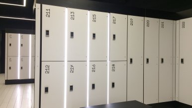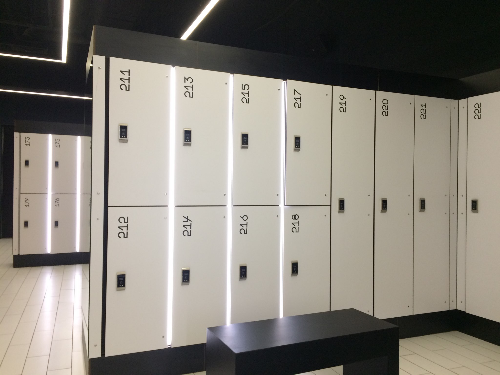 Two types of lighting were used to illuminate the locker room of the soccer club. The main lighting was provided by suspended linear luminaires based on aluminum profile. Vertical lighting of lockers was installed as additional decorative lighting.