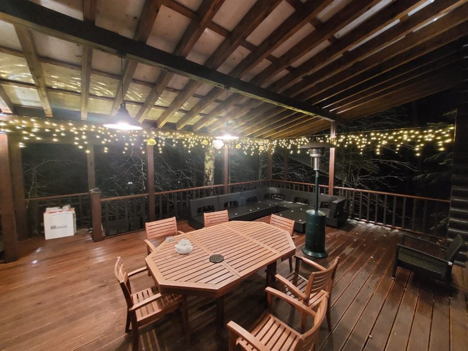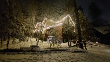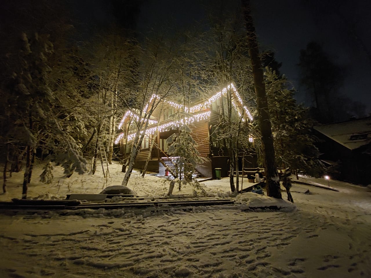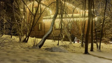 Create a fabulous and cozy atmosphere in the country house can be and in winter, using LED garlands. In this project it was enough to create lighting from the garland “fringe” around the entire perimeter of the roof to create a festive mood.
