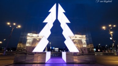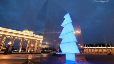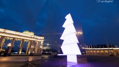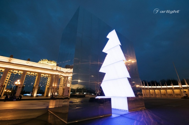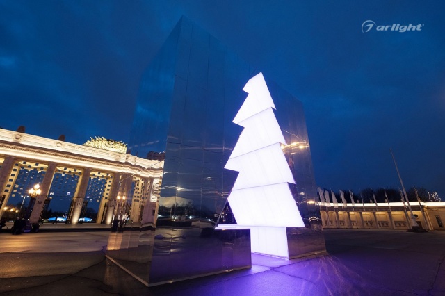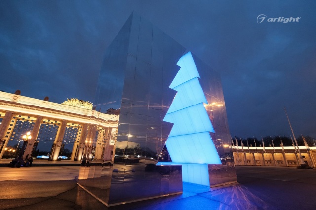 The New Year's installation was installed at the main entrance to the park. It is a massive cube made of composite material with a reflective surface, in the body of which the contour of the main symbol of the holiday - the Christmas tree - is cut out.