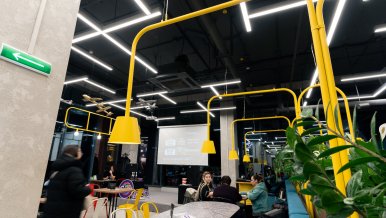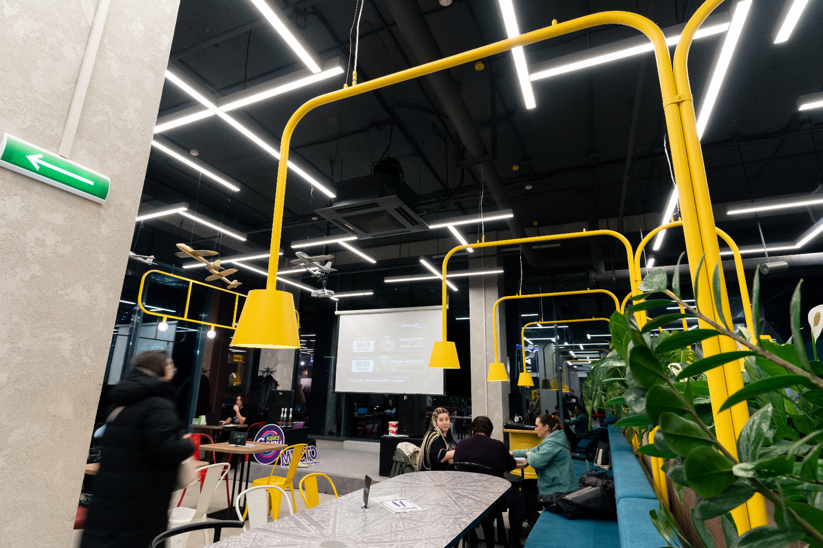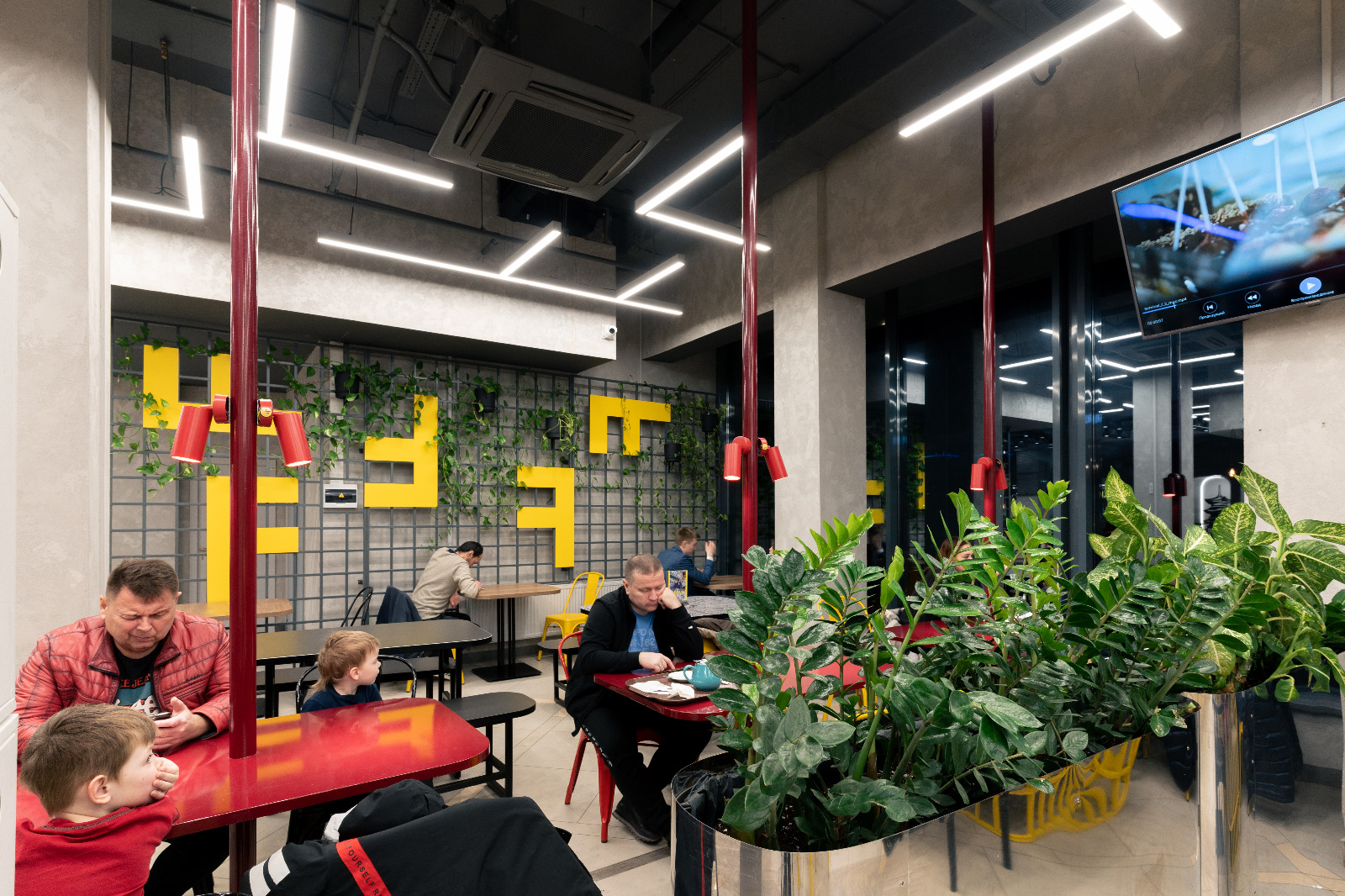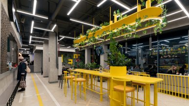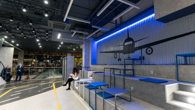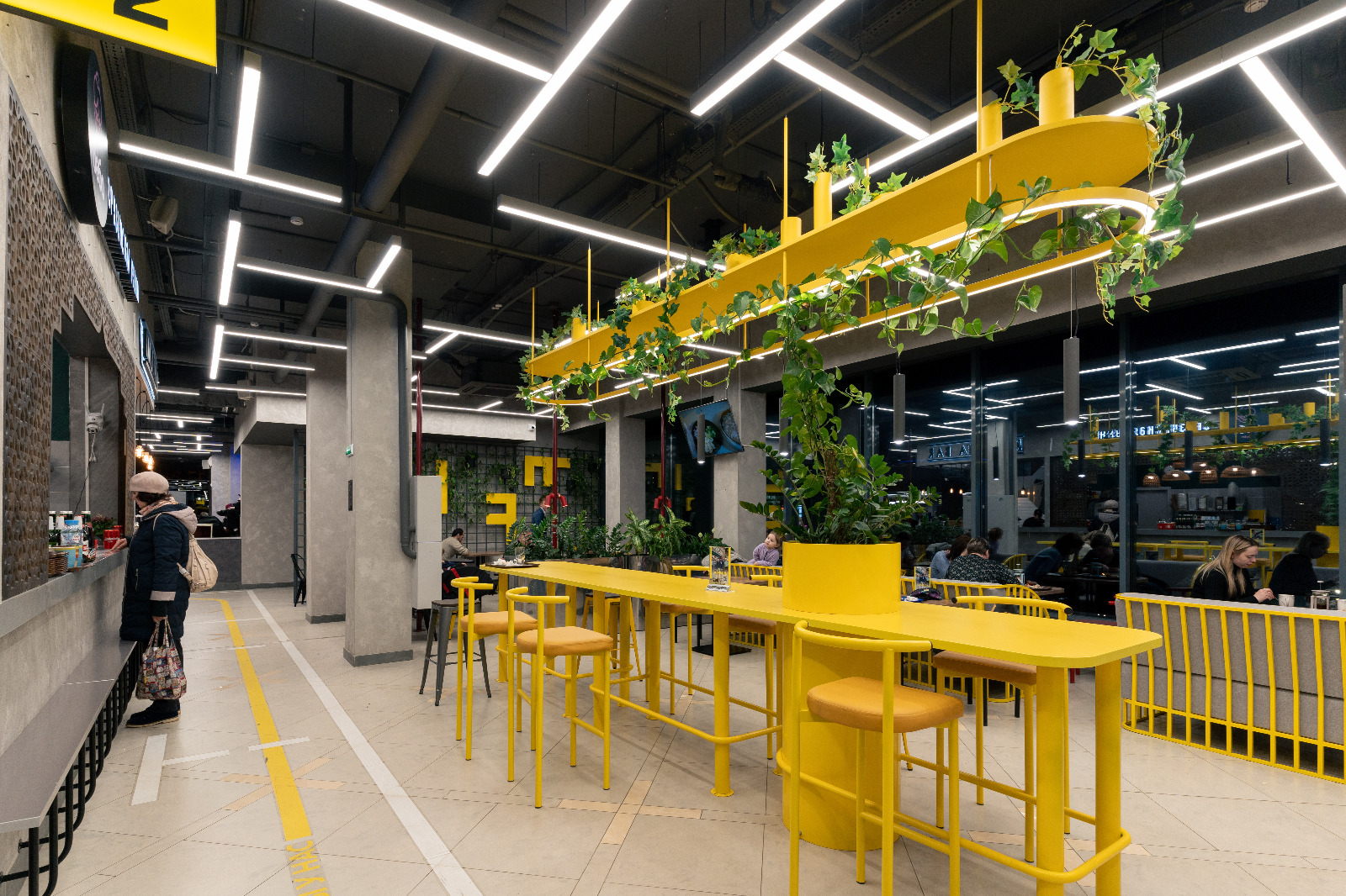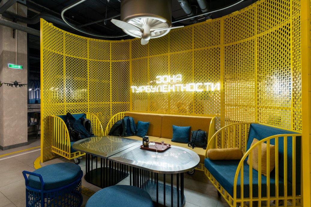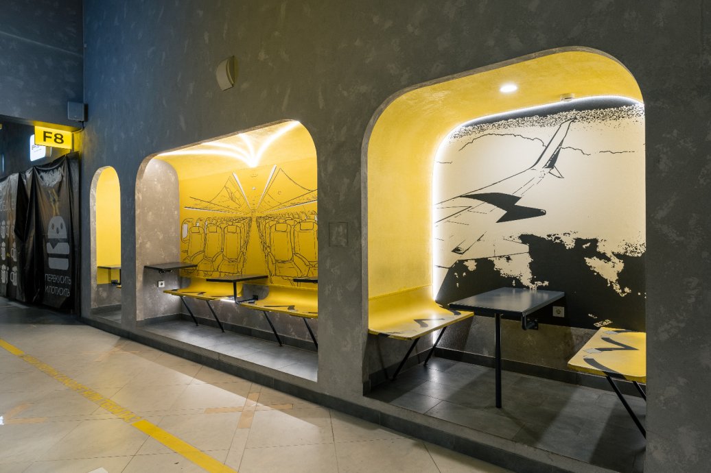 Stylish food court spaces can be used as photo zones. Separated by a yellow lattice screen, the cozy area attracts attention with contrasting yellow and blue colors, original chairs resembling luggage carts and bright neon lettering. Another interesting place is a two-level podium made in rich blue color with a light installation in the form of an airplane. The light design complements local interiors favorably, giving them a finished look.