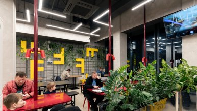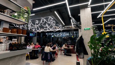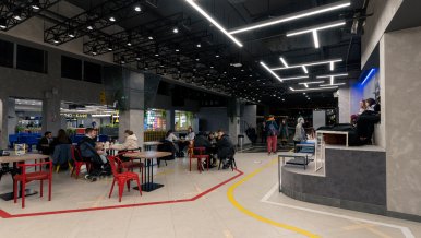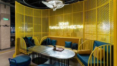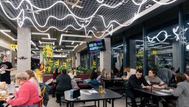 The design of the food court of the shopping center “Sigma” is made in the spirit of aviation romance. The designers tried to give the space a special atmosphere that reigns in airports, when time stands still in the streams of hurrying passengers. Many details refer visitors to air ports, airfields and airplanes. The floor markings are designed in the form of runways, the niches of the alcoves resemble an airplane cabin, and the walls are decorated with stylized views from portholes.