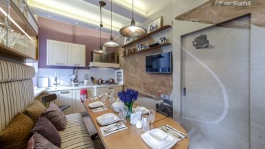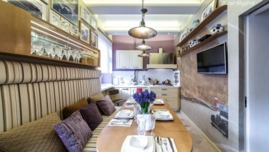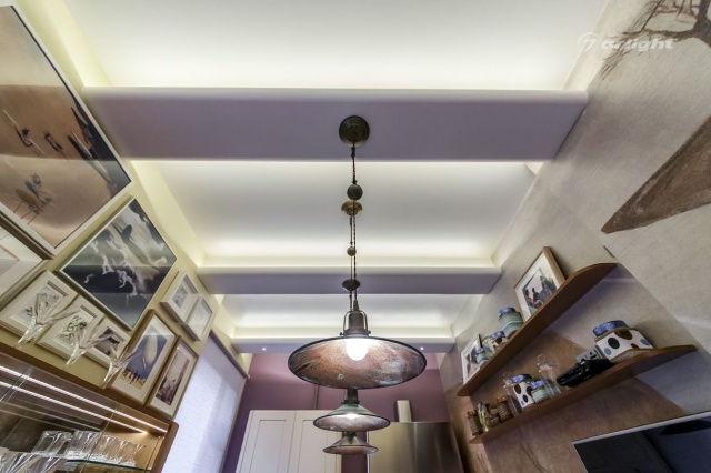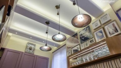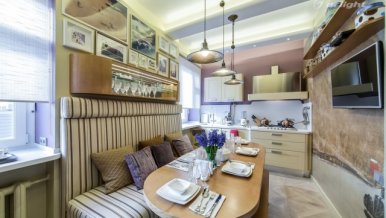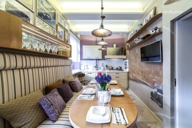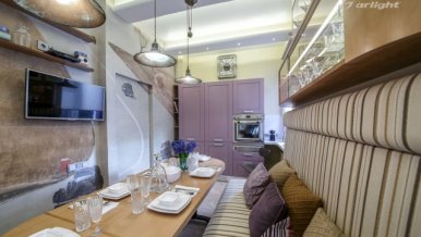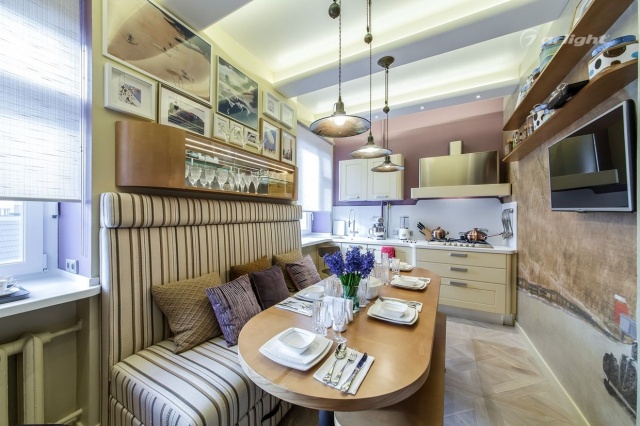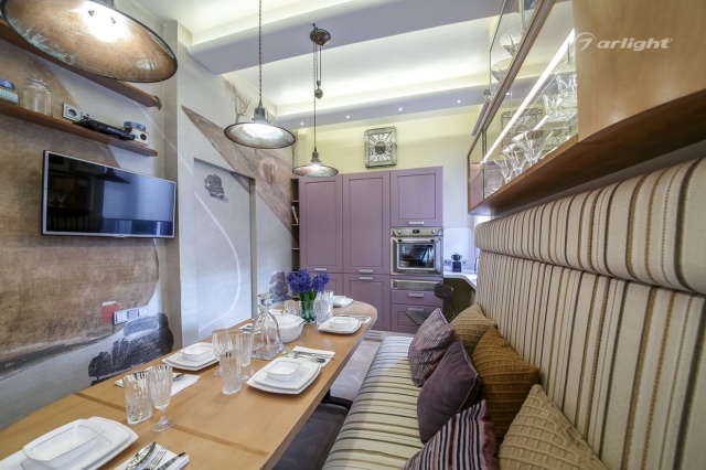 Within the framework of the project of the program “Kvartirnyi Question” the kitchen in a Stalinist house built in 1938 was renovated. One of the accents of the project is the beams illuminated with LED tape. In the room was originally one beam, which did not fit into the concept of the interior, but the designers decided not to lower the ceiling, and add a few more beams and turn the design features into a “feature” of the interior.