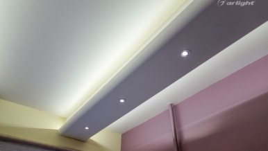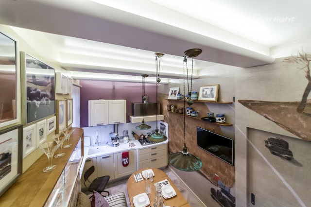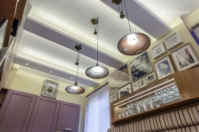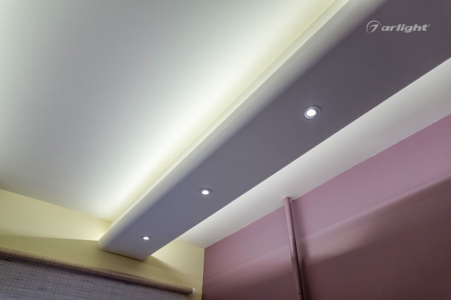 The backlighting can be controlled by a control panel placed on the wall or by remote control. The possibility of adjusting the intensity of the strip is provided by a dimmer, power supply - by a source of stabilized voltage. By controlling the backlight you can create different moods in the room.