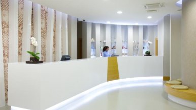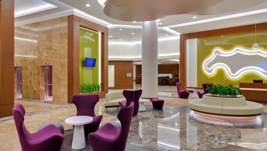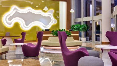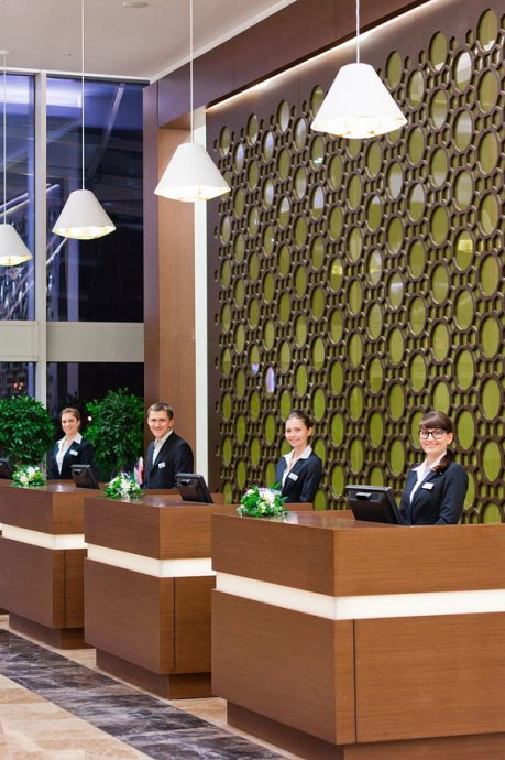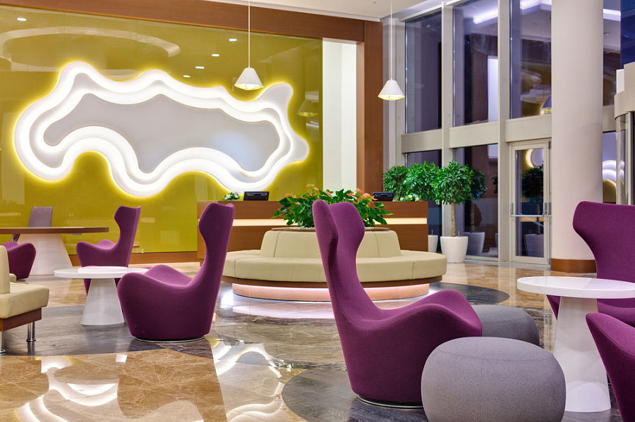 The original central design of the spacious lobby includes LED strips of white glow, which harmonize with the walls in shades of lettuce. Competent use of lighting techniques is realized in the transition from the main lighting to decorative lighting. In this environment you want to watch the fascinating play of light and enjoy the details.