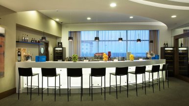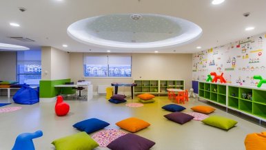 Each area of the hotel is individual. The lighting of the ceiling in the children's room is reminiscent of a view from a window in a fairytale world. And in the restaurant area, the surface of the bar radiates soft light, which is contrasted by the graceful outlines of the bar stools.