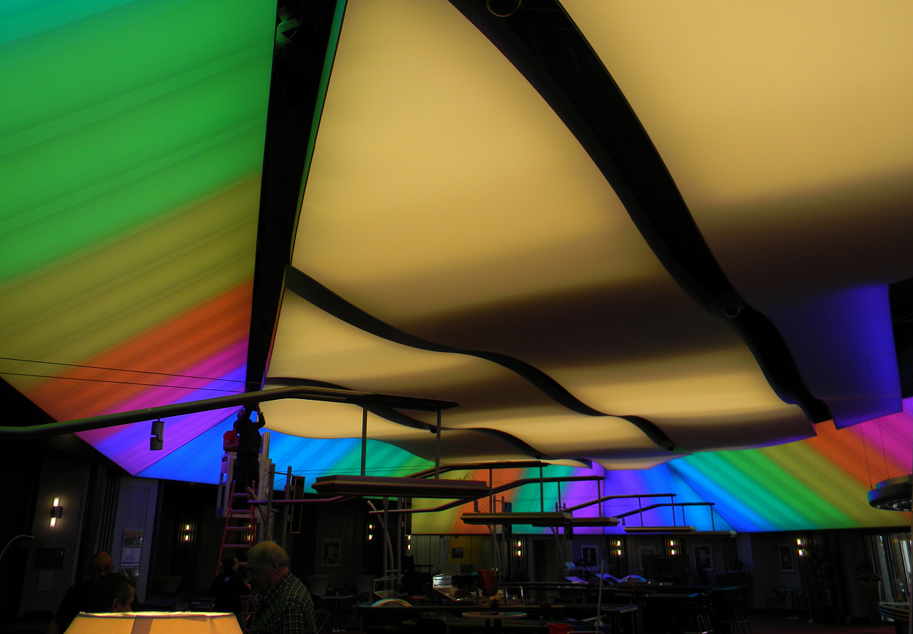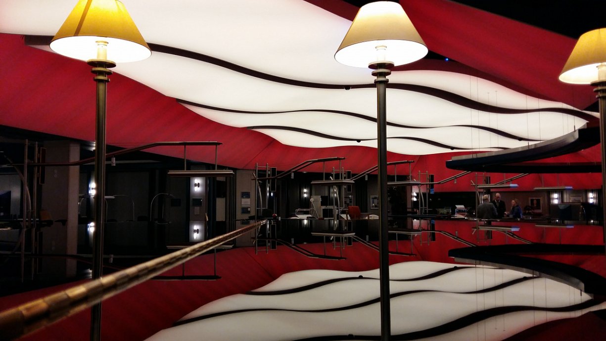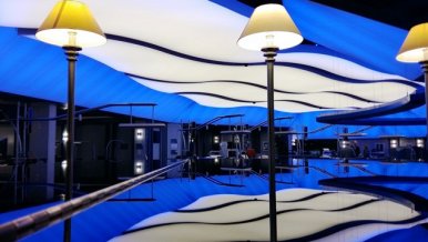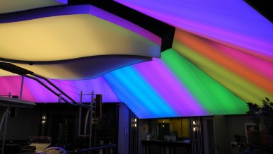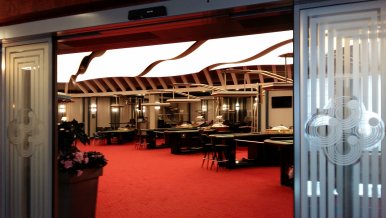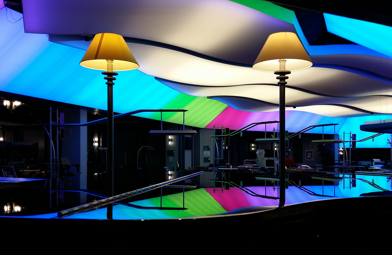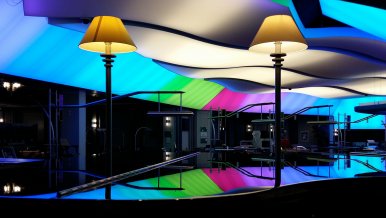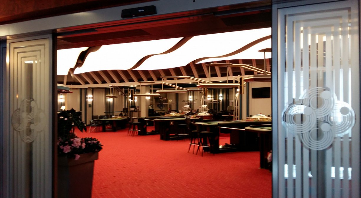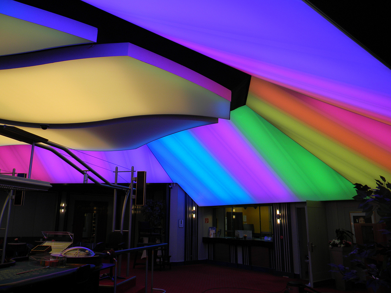 The lighting in the casino in the Bavarian resort town of Garmisch-Partenkirchen was individually designed. The main object of the entire lighting design are wide lightboxes resembling waves and running along the center of the ceiling. Lightboxes are illuminated with powerful monochrome LED strips.