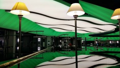 To give a festive atmosphere in the playroom around its perimeter are mounted RGB tapes, which allow you to create a variety of light-dynamic scenarios. The backlighting is controlled according to DMX standard using a four-channel decoder and a wall-mounted remote-control panel. The dynamics of light and color, reflected in the numerous glossy surfaces, fills the space and supports the gaming mood of casino guests.