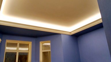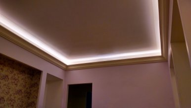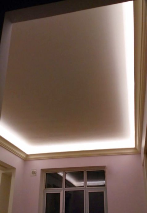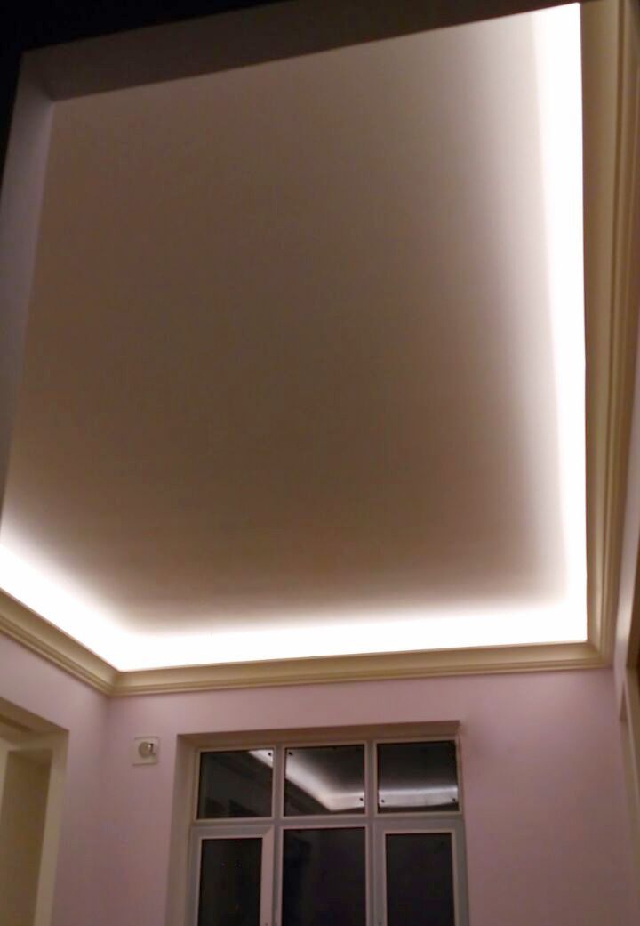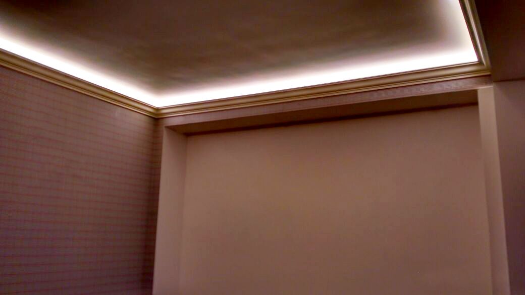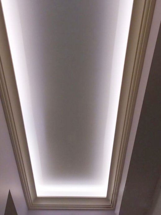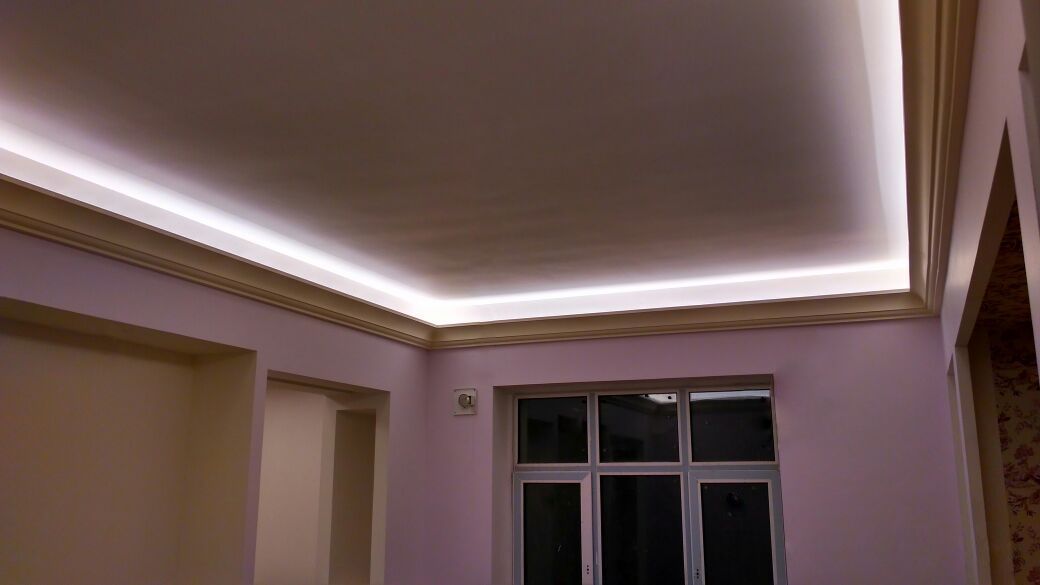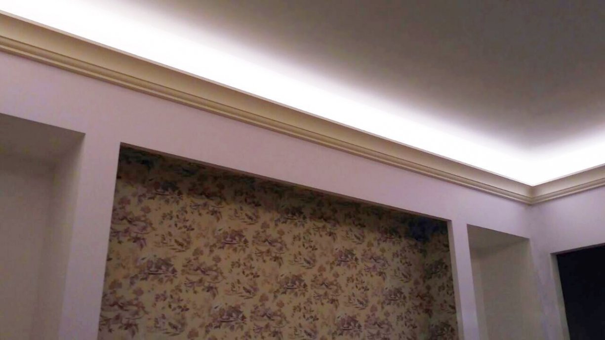 Backlighting has a decorative function, so when installing was chosen a method in which the glow of the tape is directed upward. This gives a visual effect of a “floating” ceiling, but deprives the possibility of using the backlighting as the main lighting.