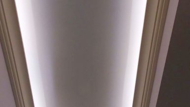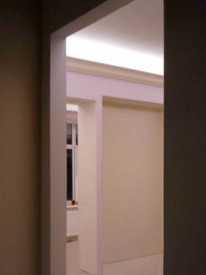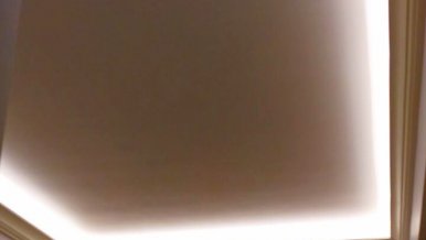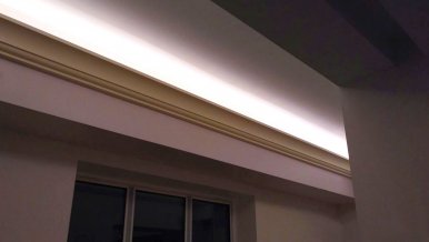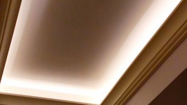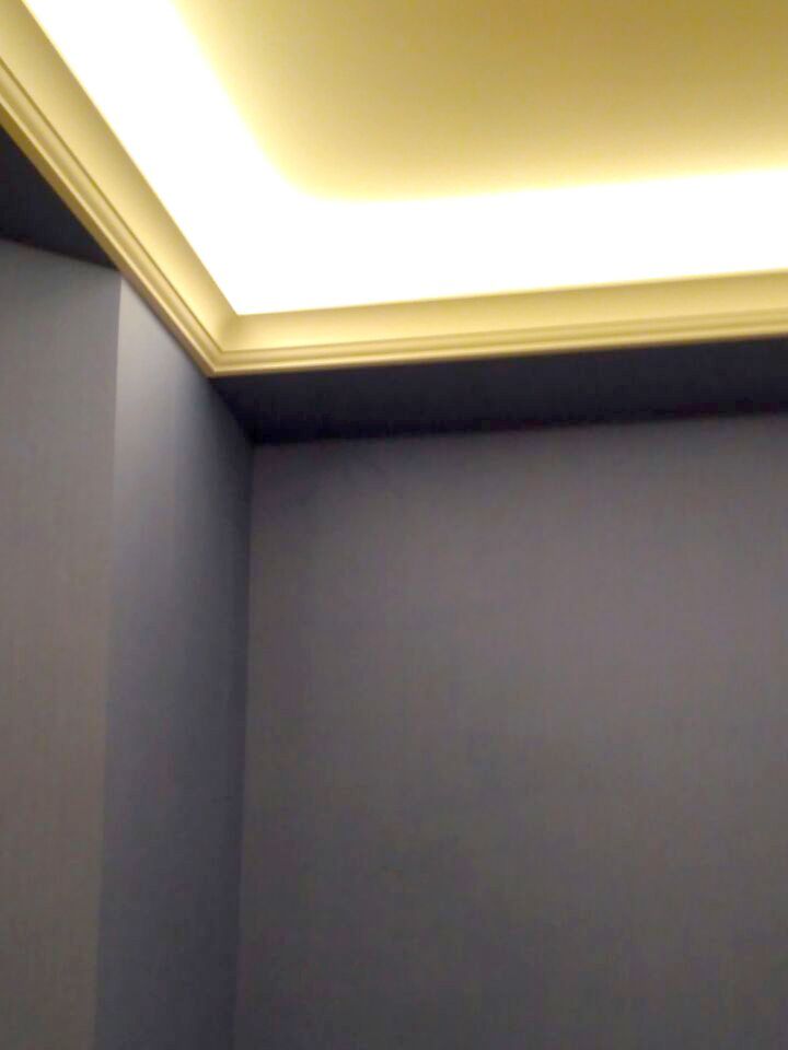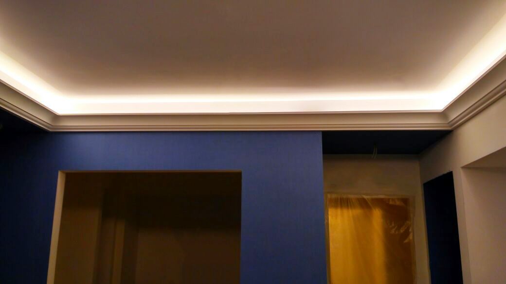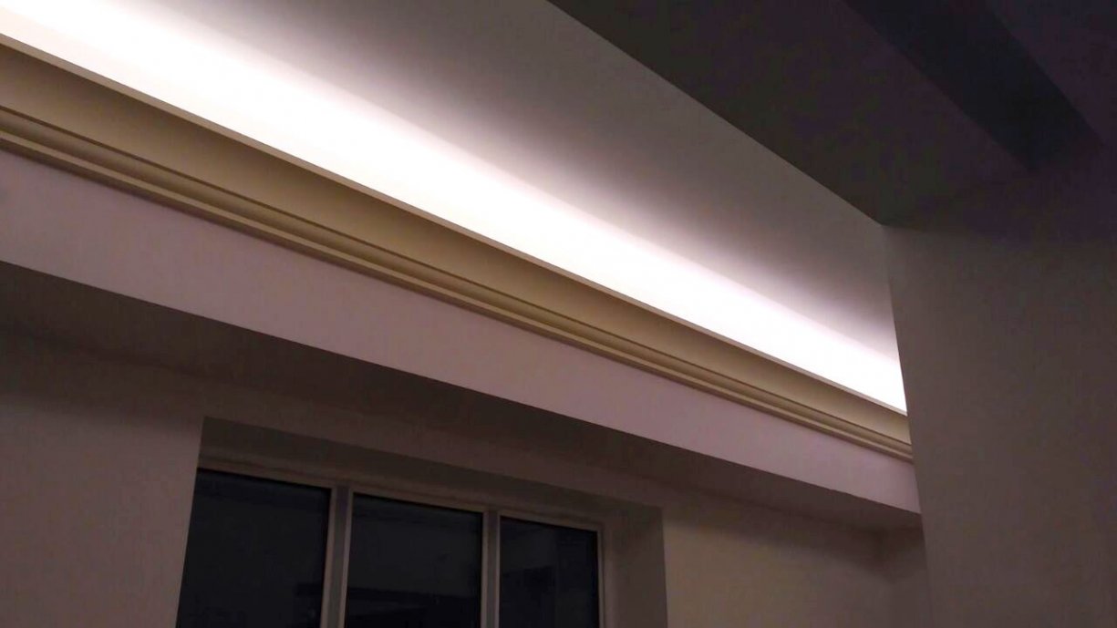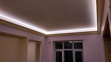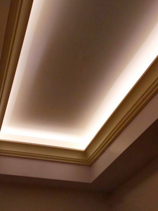 Backlighting has a decorative function, so when installing was chosen a method in which the glow of the tape is directed upward. This gives a visual effect of a “floating” ceiling, but deprives the possibility of using the backlighting as the main lighting.