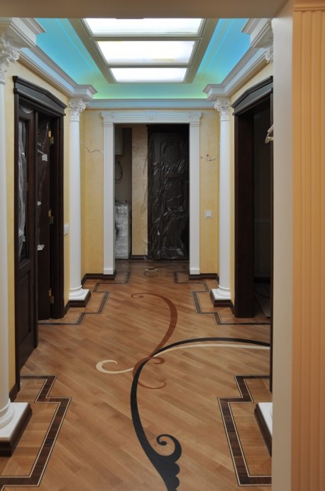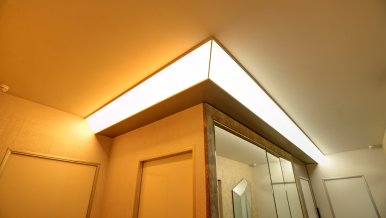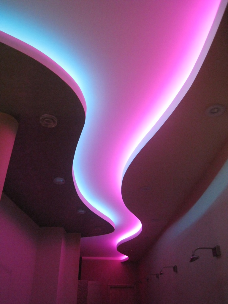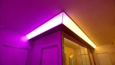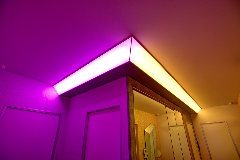 One of the most common ways to implement LED lighting is to illuminate the ceiling ledge of drywall. Depending on the color of the LED strip and its brightness, it can serve as the main lighting of the corridor or decorative lighting. Such illumination is often combined with spotlights, in this case they serve as a source of main light, and LED tape - background or decorative. For decorative backlighting is often used multicolor LED strip RGB. To control multicolor LED strip are used controllers that allow you to choose thousands of different colors and shades. While the controller controls the LEDs on the strip, the controller itself is controlled by the user from a wall panel for RGB light sources. The touch-sensitive glass panels with color selection ring are responsive to touch and very easy to handle. Wireless control of LED lighting is possible with a remote control.