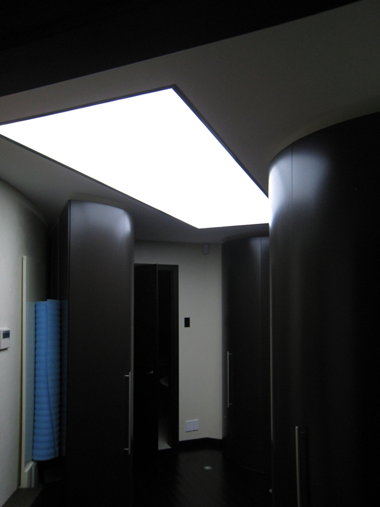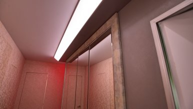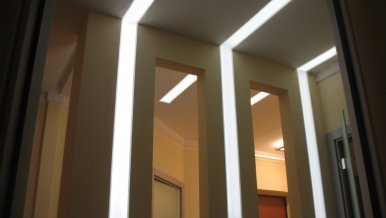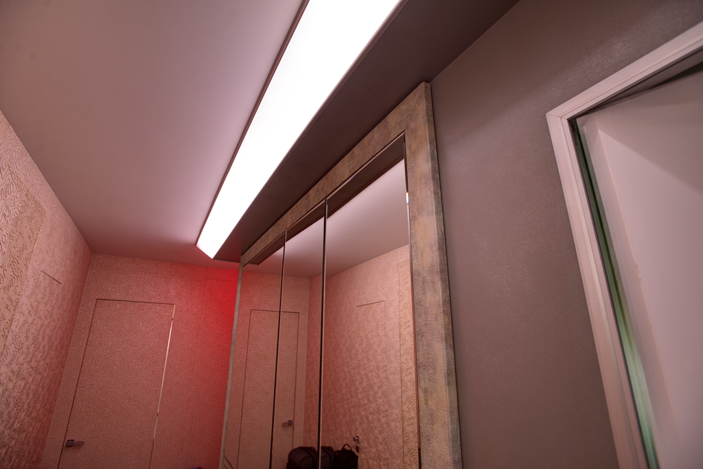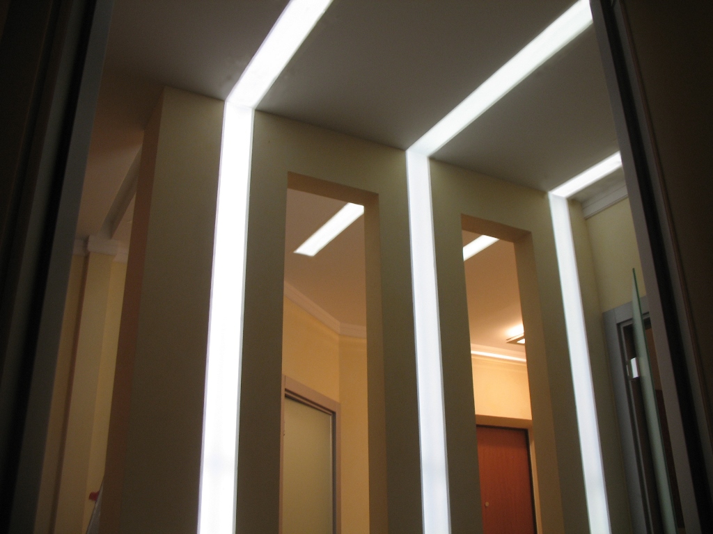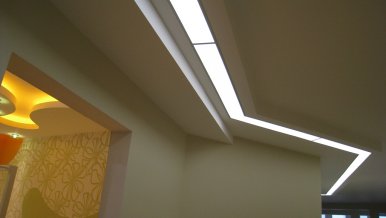 Another method that is gaining popularity is LED light lines. They are linear lights made of LED profile, high-power LED strip and a special screen that covers the profile and the strip. Usually, lines of light are built into ceilings or walls made of drywall. Effectively looks continuous line, passing from the ceiling to the wall, an example of such a design can be seen in one of the photos of this project.