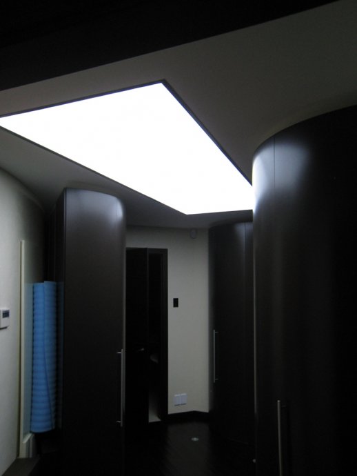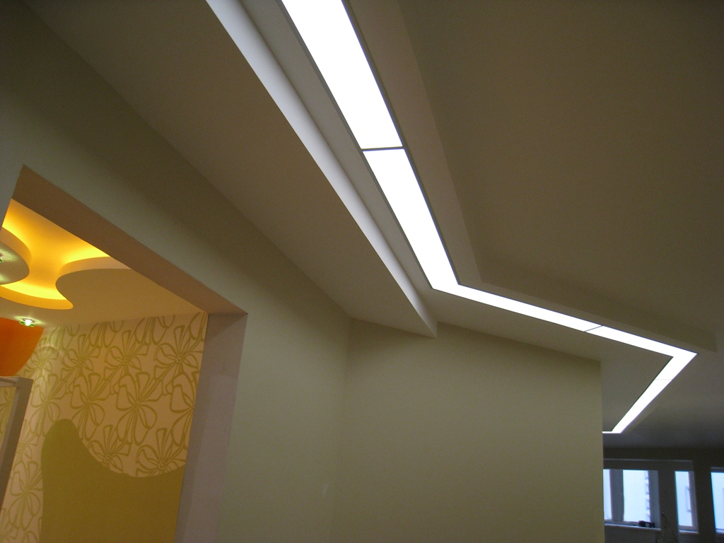 Less common due to the greater complexity of installation, but an effective way of lighting - luminous ceiling. This uses a bright LED strip and translucent stretch ceiling or frosted plexiglass white.