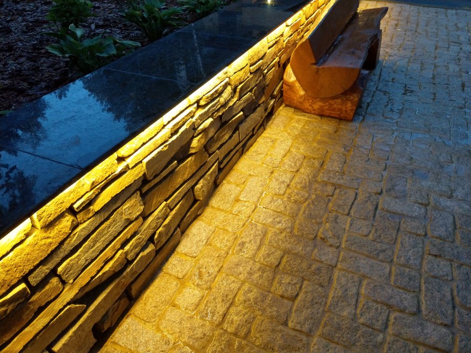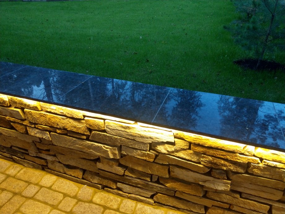 In addition to the decorative function, lighting of the parapet in the dark provides safety of movement, and also zoned space, separating the passable sidewalk from the unlit green massif.