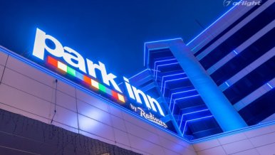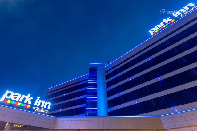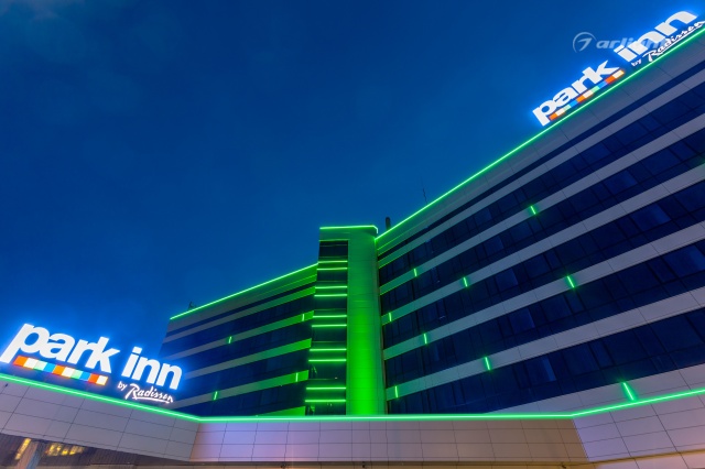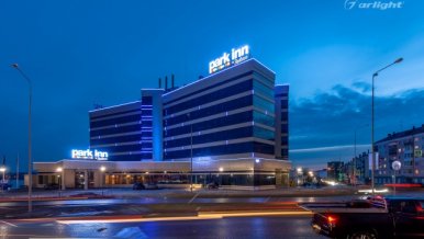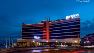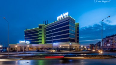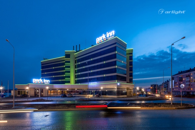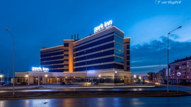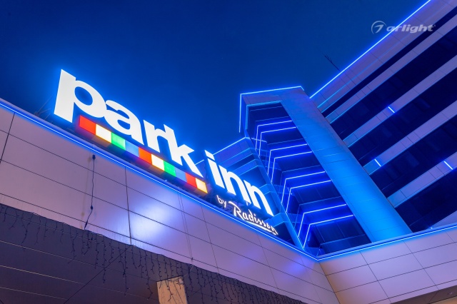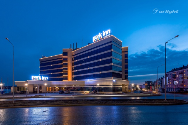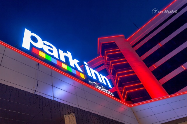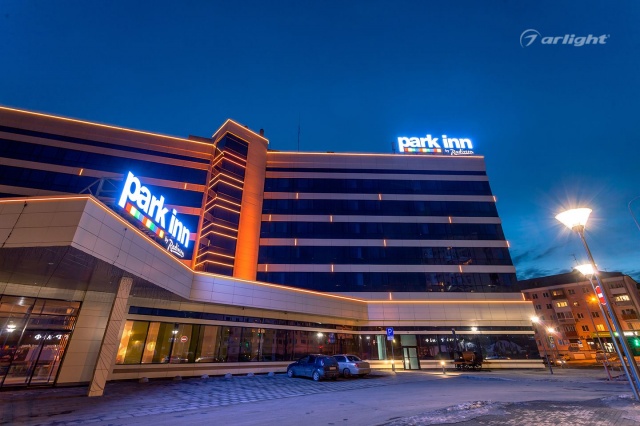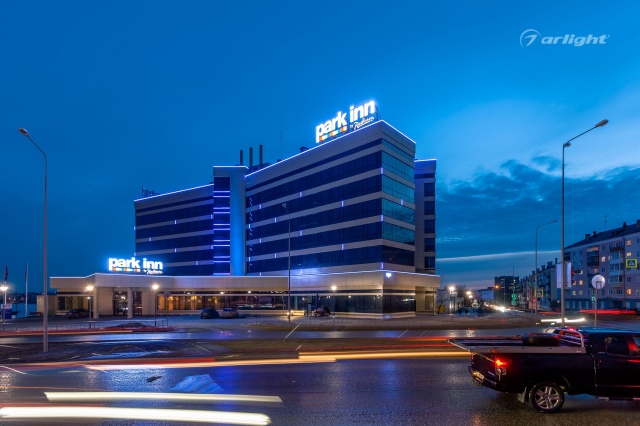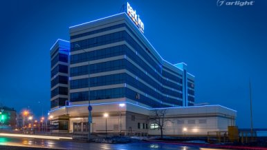 The geometric shapes of the Park Inn hotel building in Nizhny Tagil are emphasized by contoured backlighting. The backlighting is made of multicolor LED tape on the basis of an aluminum profile. The profile is covered with matte screens, which create a softer and diffused light.