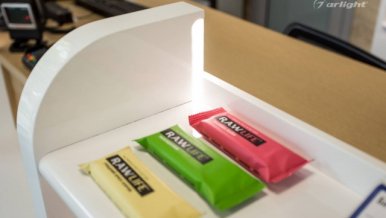 The tracks are placed along the walls farthest from the entrance. The luminaires placed on them create a directional glow: one row illuminates the decorative wall made of wood, and the second row illuminates the presented products. Mobility of setting up light scenes is the main advantage of track systems. Lighting control becomes convenient and fast. The overall illumination can be changed by removing or adding luminaires to the tracks. The direction of illumination is adjustable thanks to the design of the luminaire body - they can rotate around their axis. In addition, the luminaires can be moved along the track, allowing you to shift the lighting accents.