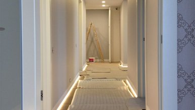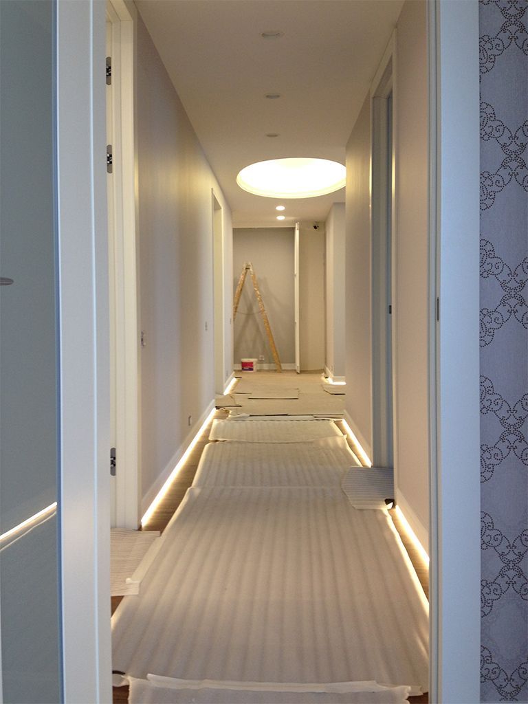 In the entrance area and corridor, the role of the main lighting is performed by built-in LED luminaires Arlight, combining reliability, economy and high quality characteristics. Additional lighting is also installed along the baseboards.